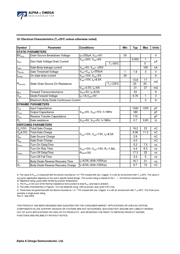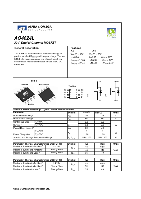 The AO4824L uses advanced trench technology to provide excellent RDS(ON) and low gate charge.