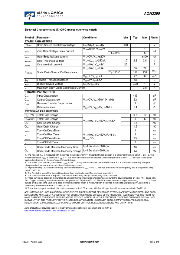 The AON2290 combines advanced trench MOSFET technology with a low resistance package to provide extremely low RDS(ON).