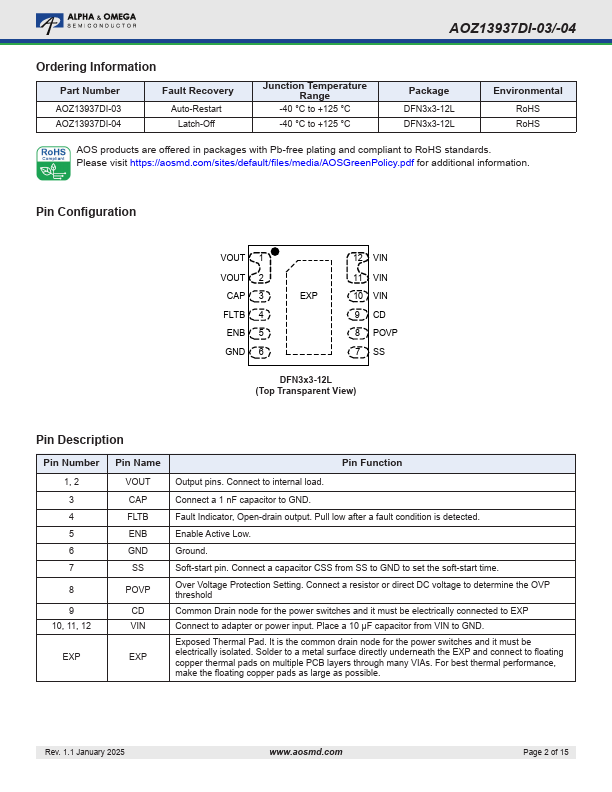 AOZ13937DI is protection switch intended for applications that require reverse current protection.
