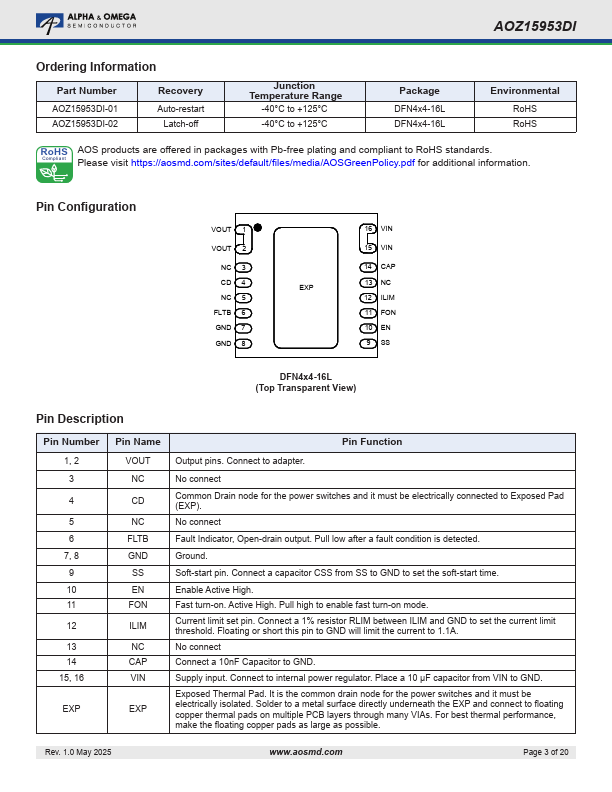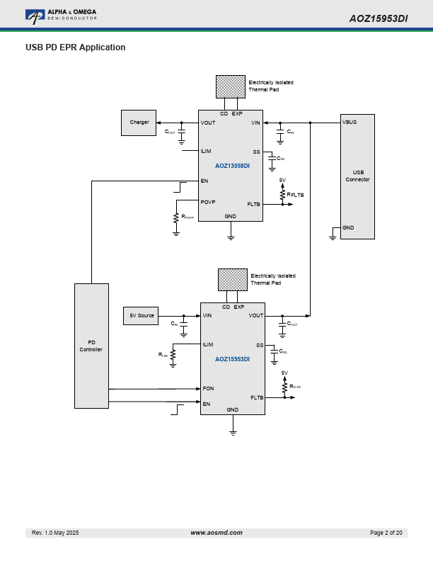 The AOZ15953DI is a protection switch intended for USB Type-C PD EPR applications that require reverse current protection.
