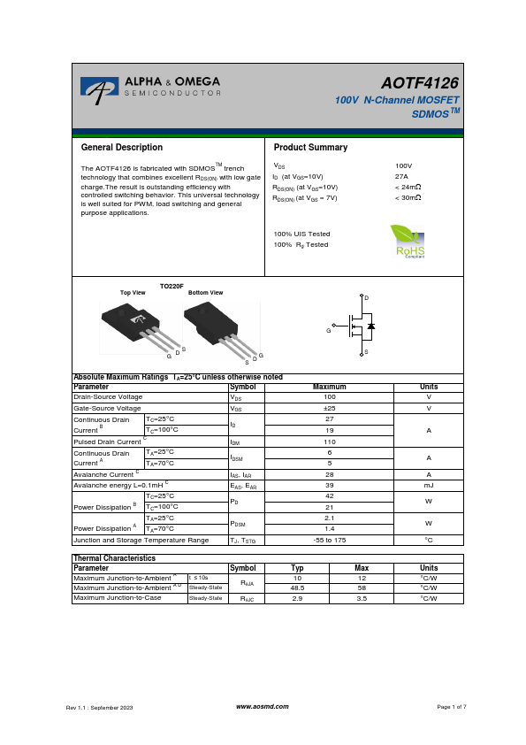 Product Summary The AOTF4126 is fabricated with SDMOSTM trench technology that bines excellent RDS(ON) with low gate charge.The result is outstanding efficiency with controlled switching behavior. This universal technology is well suited for PWM, load switching and general purpose applications. The value of RqJA is measured with the device mounted on 1in2 FR-4 board with 2oz.