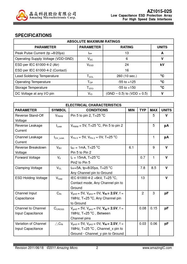 immunity requirements of IEC 61000-4-2, Level 4 (± 15kV air, ±8kV contact discharge). Circuit Diagram 5 3 4 2 AZ1015-02S is a high performance design which includes surge rated diode arrays to protect high speed data interfaces. The AZ1015-02S has been specifically designed to protect sensitive ponents, which are connected to data and transmission lines, from over-voltage caused by Electrostatic Discharging (ESD),...