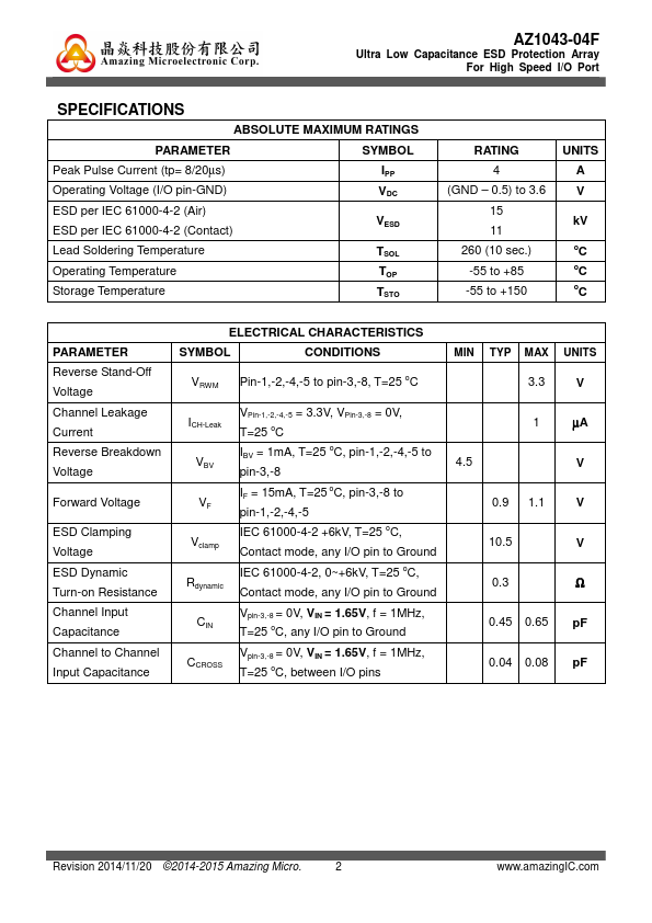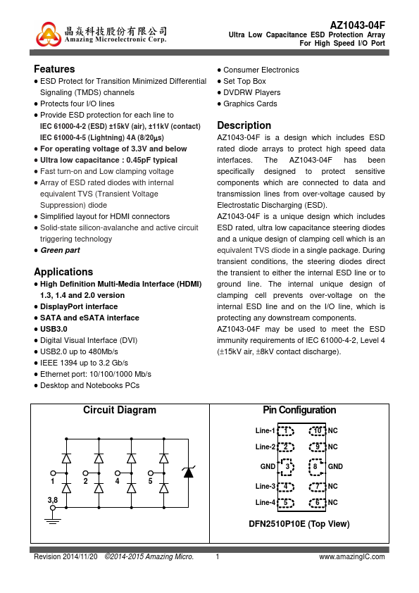 AZ1043-04F is a design which includes ESD rated diode arrays to protect high speed data interfaces. The AZ1043-04F has been specifically designed to protect sensitive ponents which are connected to data and transmission lines from over-voltage caused by Electrostatic Discharging (ESD). AZ1043-04F is a unique design which includes ESD rated, ultra low capacitance steering diodes and a unique design of clamping cell...