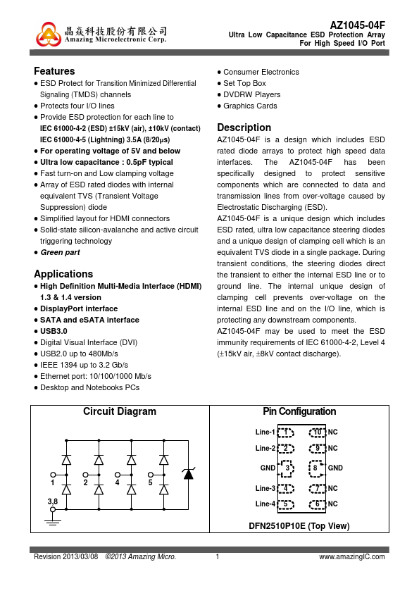 AZ1045-04F is a design which includes ESD rated diode arrays to protect high speed data interfaces. The AZ1045-04F has been specifically designed to protect sensitive ponents which are connected to data and transmission lines from over-voltage caused by Electrostatic Discharging (ESD). AZ1045-04F is a unique design which includes ESD rated, ultra low capacitance steering diodes and a unique design of clamping cell...