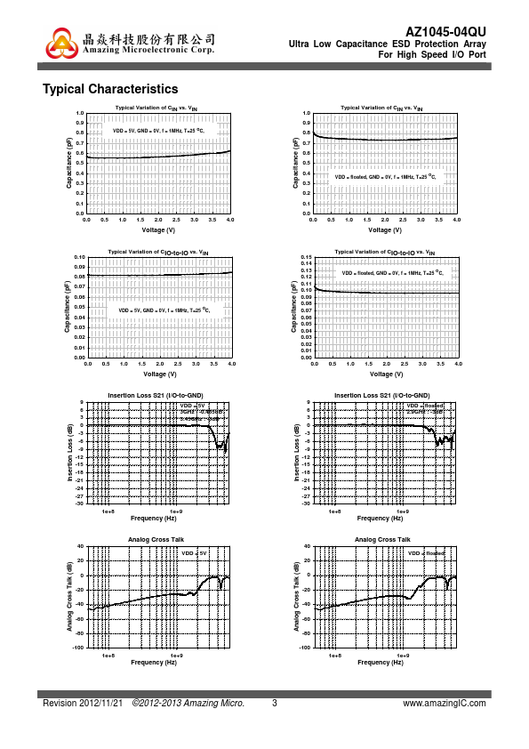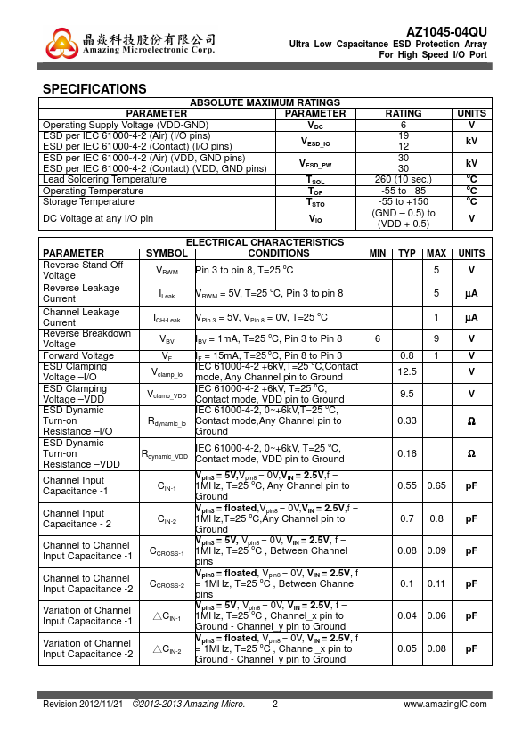 AZ1045-04QU is a design which includes surge rated diode arrays to protect high speed data interfaces. The AZ1045-04QU has been specifically designed to protect sensitive ponents which are connected to data and transmission lines from over-voltage caused by Electrostatic Discharging (ESD). AZ1045-04QU is a unique design which includes surge rated, ultra low capacitance steering diodes and a unique design of clamping...