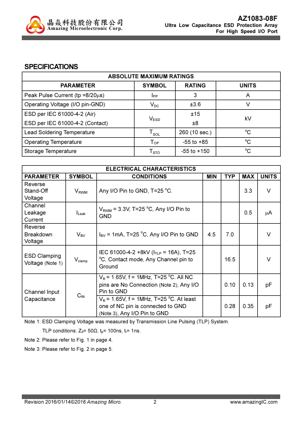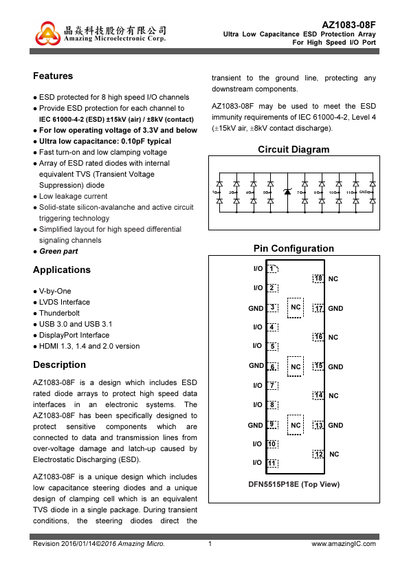 AZ1083-08F is a design which includes ESD rated diode arrays to protect high speed data interfaces in an electronic systems. The AZ1083-08F has been specifically designed to protect sensitive ponents which are connected to data and transmission lines from over-voltage damage and latch-up caused by Electrostatic Discharging (ESD). AZ1083-08F is a unique design which includes low capacitance steering diodes and a...