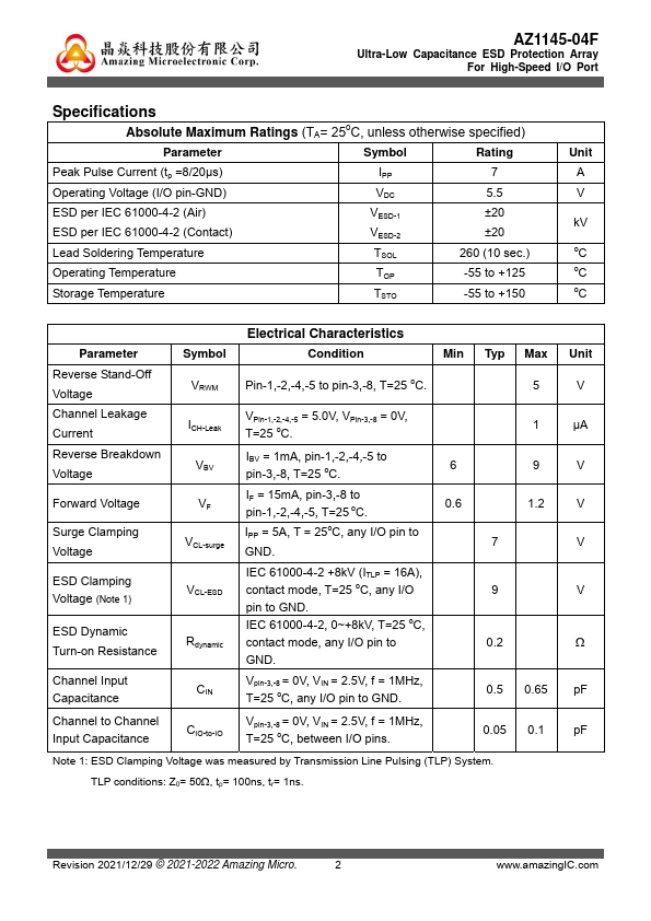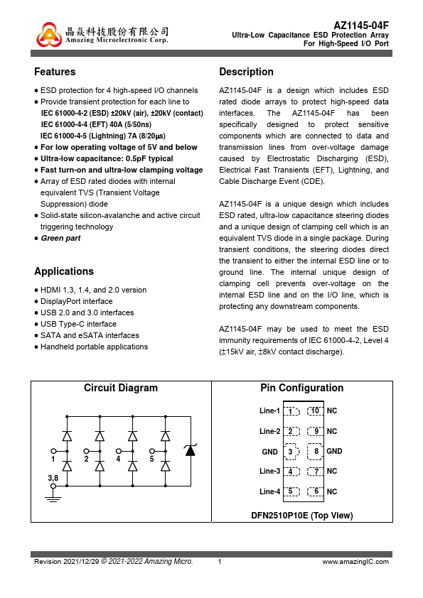 AZ1145-04F is a design which includes ESD rated diode arrays to protect high-speed data interfaces. The AZ1145-04F has been specifically designed to protect sensitive ponents which are connected to data and transmission lines from over-voltage damage caused by Electrostatic Discharging (ESD), Electrical Fast Transients (EFT), Lightning, and Cable Discharge Event (CDE). AZ1145-04F is a unique design which includes...