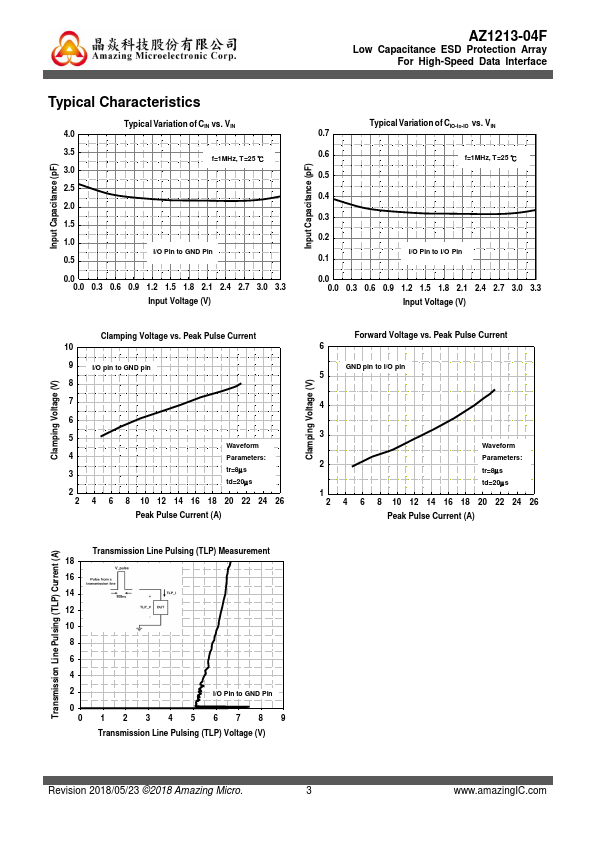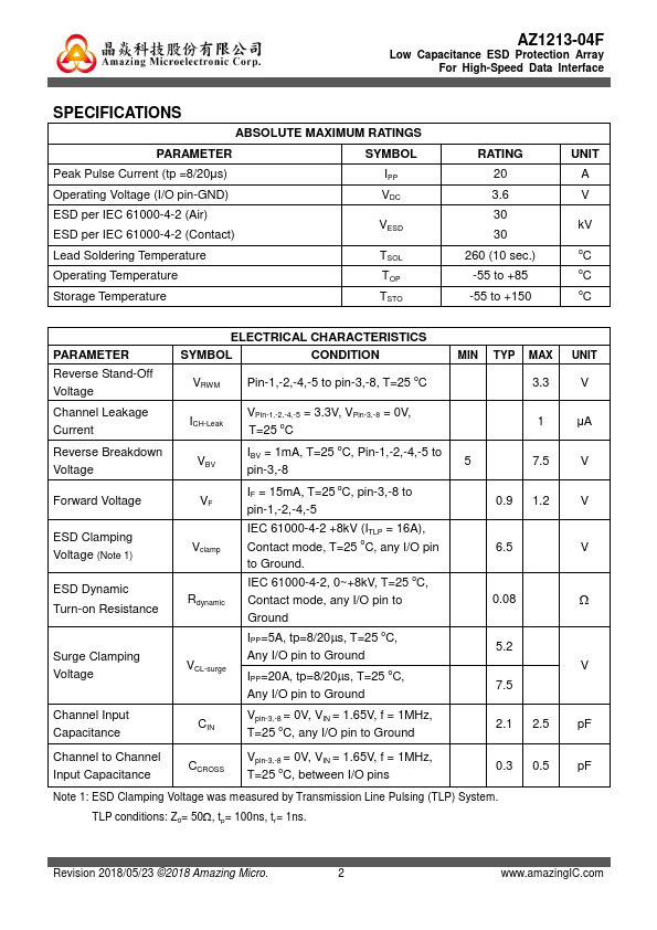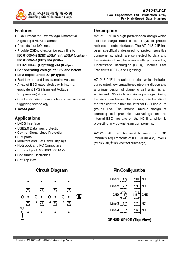 AZ1213-04F is a high-performance design which includes surge rated diode arrays to protect high-speed data interfaces. The AZ1213-04F has been specifically designed to protect sensitive ponents, which are connected to data and transmission lines, from over-voltage caused by Electrostatic Discharging (ESD), Electrical Fast Transients (EFT), and Lightning. AZ1213-04F is a unique design which includes surge rated, low...