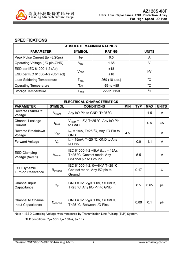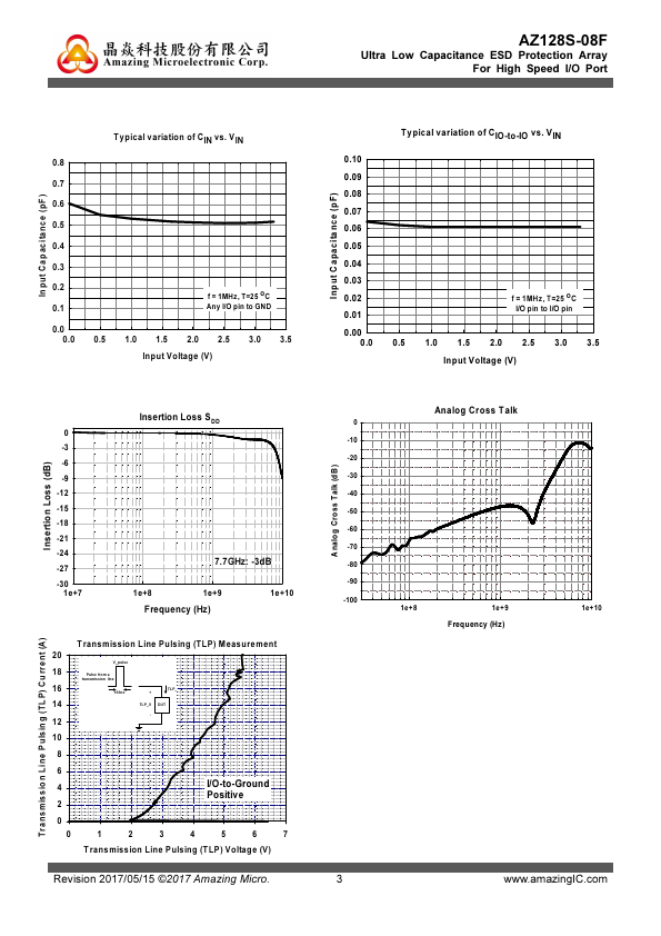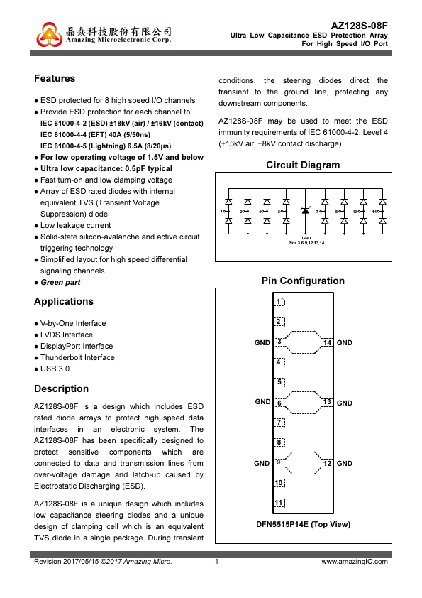 AZ128S-08F is a design which includes ESD rated diode arrays to protect high speed data interfaces in an electronic system. The AZ128S-08F has been specifically designed to protect sensitive ponents which are connected to data and transmission lines from over-voltage damage and latch-up caused by Electrostatic Discharging (ESD). AZ128S-08F is a unique design which includes low capacitance steering diodes and a...