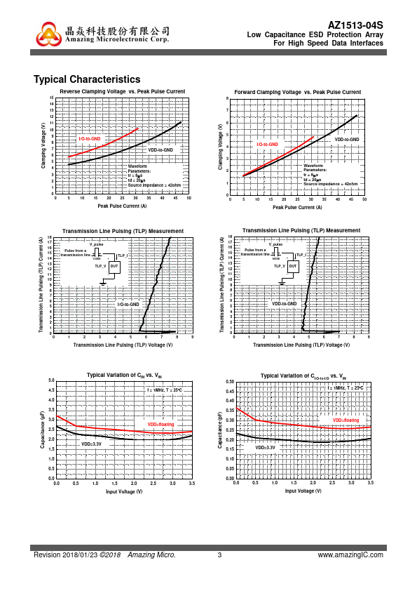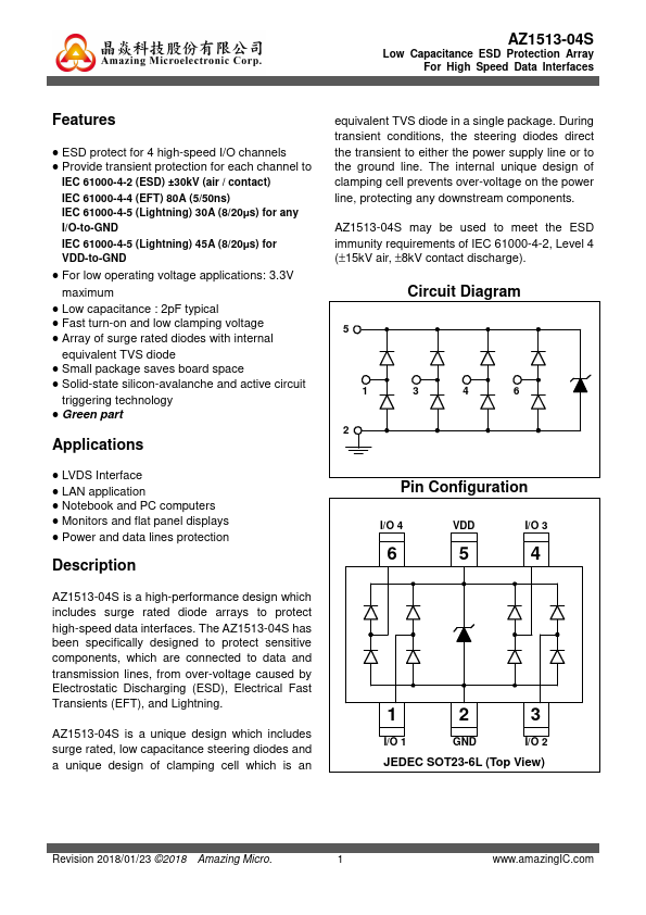 I/O 4 VDD I/O 3 6 5 4 AZ1513-04S is a high-performance design which includes surge rated diode arrays to protect high-speed data interfaces. The AZ1513-04S has been specifically designed to protect sensitive ponents, which are connected to data and transmission lines, from over-voltage caused by Electrostatic Discharging (ESD), Electrical Fast Transients (EFT), and Lightning. 3.3 V Reverse Leakage Current ILeak VRWM...