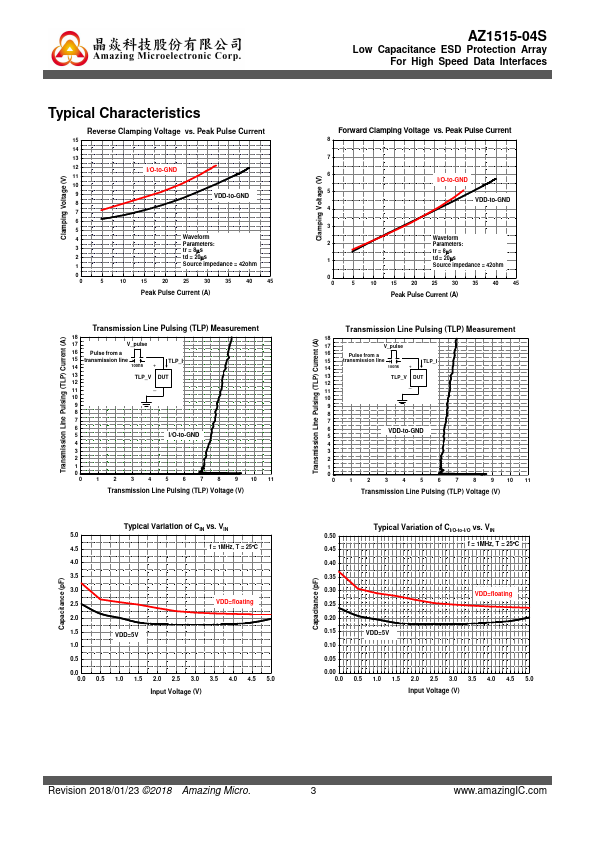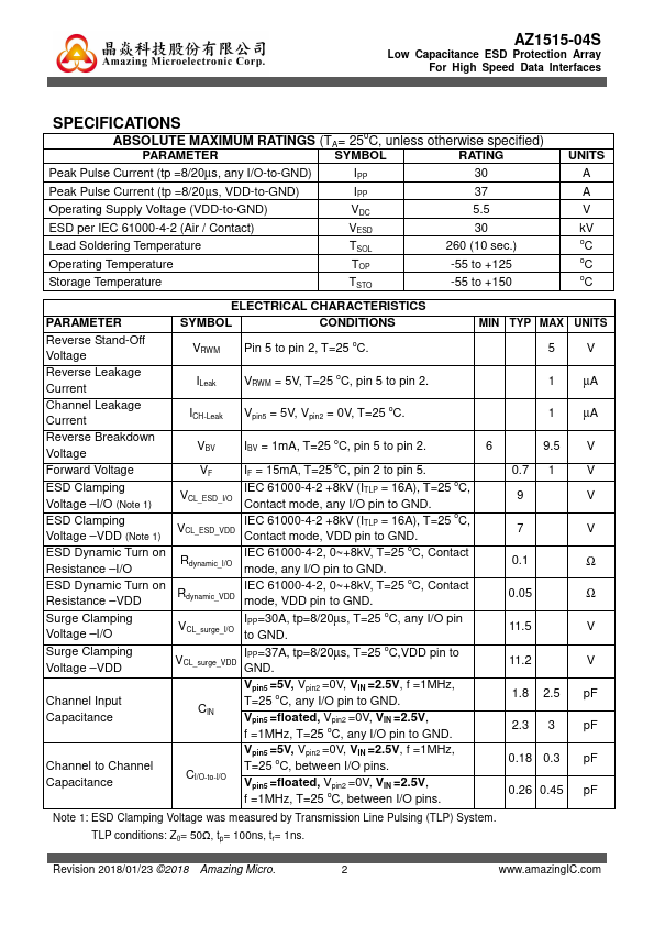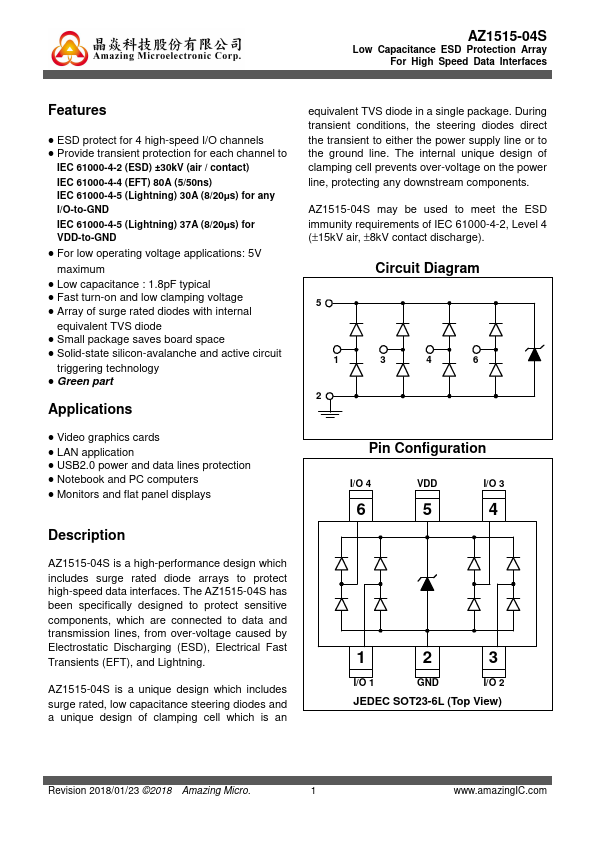 I/O 4 VDD I/O 3 6 5 4 AZ1515-04S is a high-performance design which includes surge rated diode arrays to protect high-speed data interfaces. The AZ1515-04S has been specifically designed to protect sensitive ponents, which are connected to data and transmission lines, from over-voltage caused by Electrostatic Discharging (ESD), Electrical Fast Transients (EFT), and Lightning. ILeak VRWM = 5V, T=25 oC, pin 5 to pin.