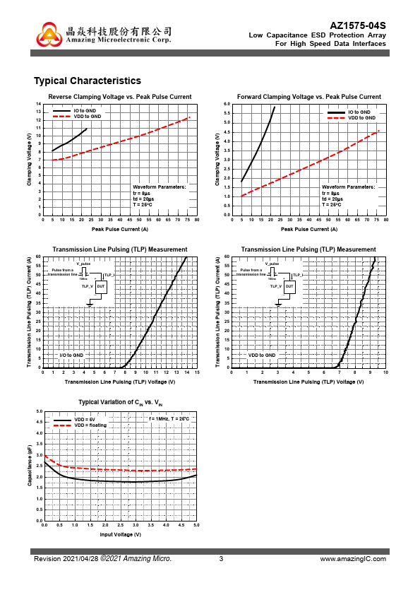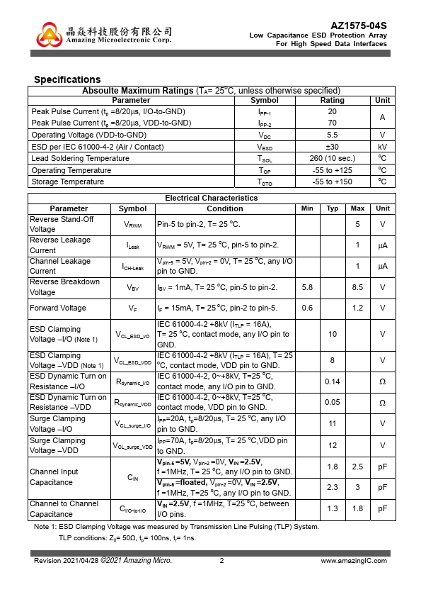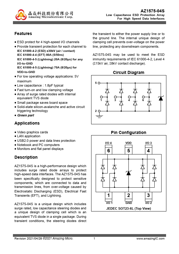 AZ1575-04S is a high-performance design which includes surge rated diode arrays to protect high-speed data interfaces. The AZ1575-04S has been specifically designed to protect sensitive ponents, which are connected to data and transmission lines, from over-voltage caused by Electrostatic Discharging (ESD), Electrical Fast Transients (EFT), and Lightning. AZ1575-04S is a unique design which includes surge rated, low...