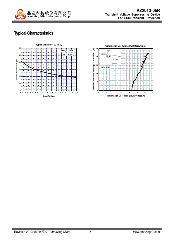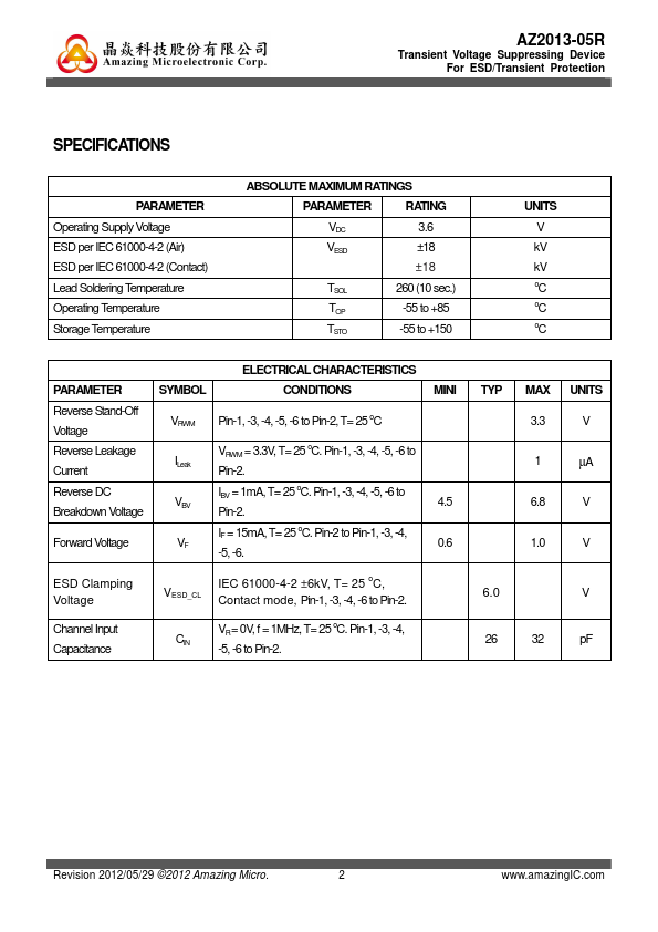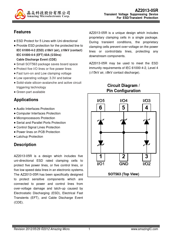 AZ2013-05R is a unique design which includes proprietary clamping cells in a single package. During transient conditions, the proprietary clamping cells prevent over-voltage on the power lines or control/data lines, protecting any downstream ponents. AZ2013-05R may be used to meet the ESD immunity requirements of IEC 61000-4-2, Level 4 (±15kV air, ±8kV contact discharge).