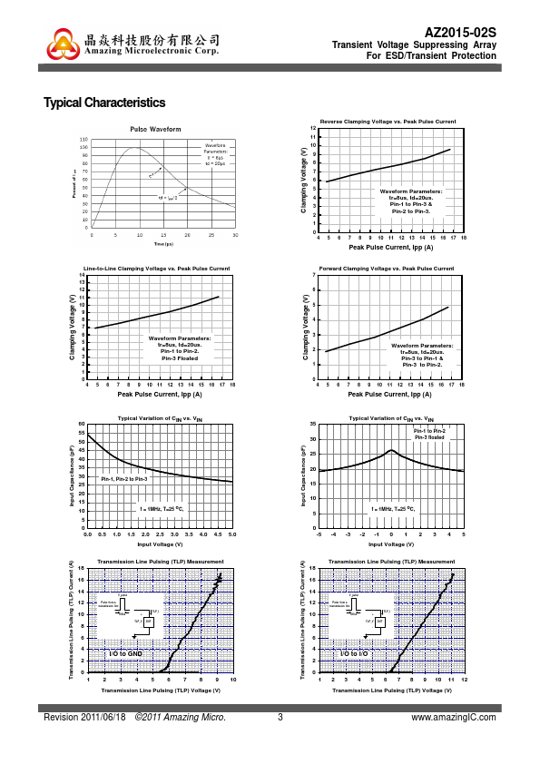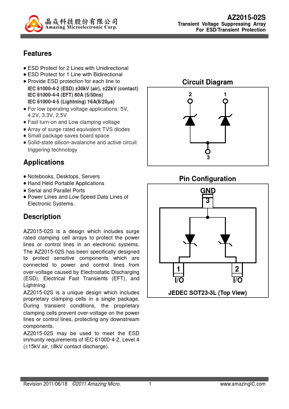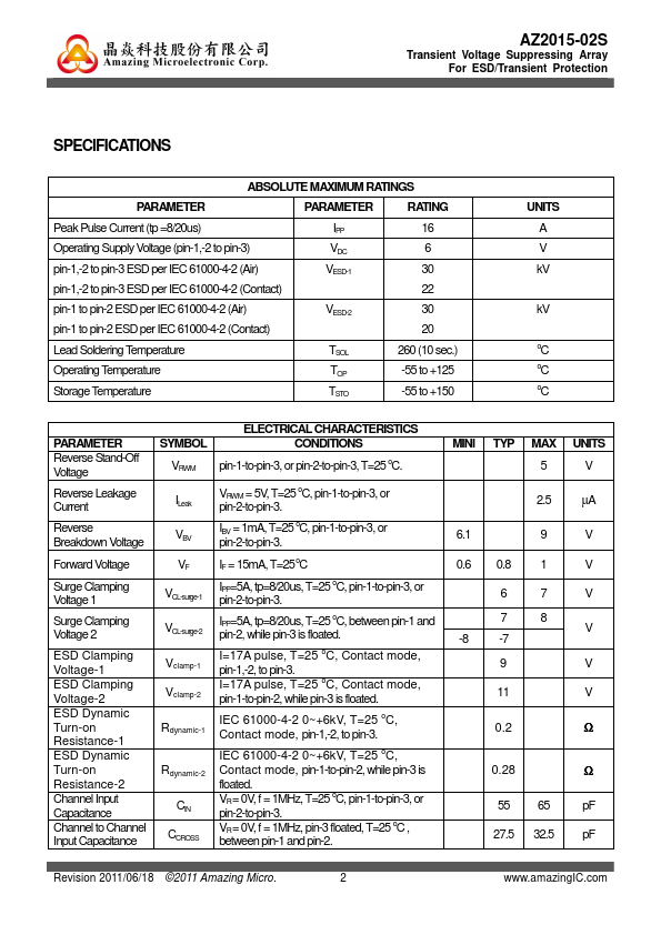 AZ2015-02S is a design which includes surge rated clamping cell arrays to protect the power lines or control lines in an electronic systems. The AZ2015-02S has been specifically designed to protect sensitive ponents which are connected to power and control lines from over-voltage caused by Electrostatic Discharging (ESD), Electrical Fast Transients (EFT), and Lightning. AZ2015-02S is a unique design which includes...