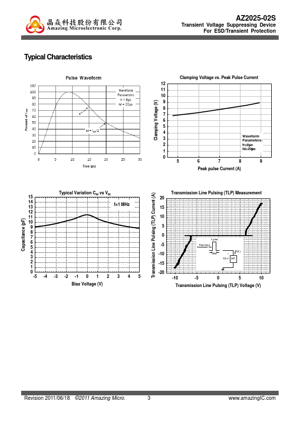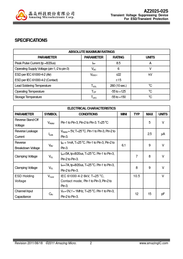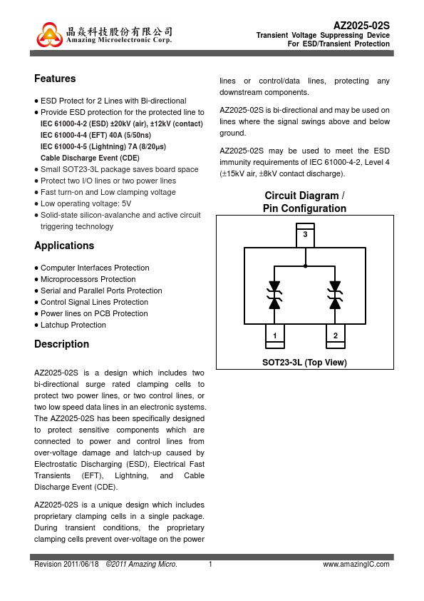 AZ2025-02S is a design which includes two bi-directional surge rated clamping cells to protect two power lines, or two control lines, or two low speed data lines in an electronic systems. The AZ2025-02S has been specifically designed to protect sensitive ponents which are connected to power and control lines from over-voltage damage and latch-up caused by Electrostatic Discharging (ESD), Electrical Fast Transients...