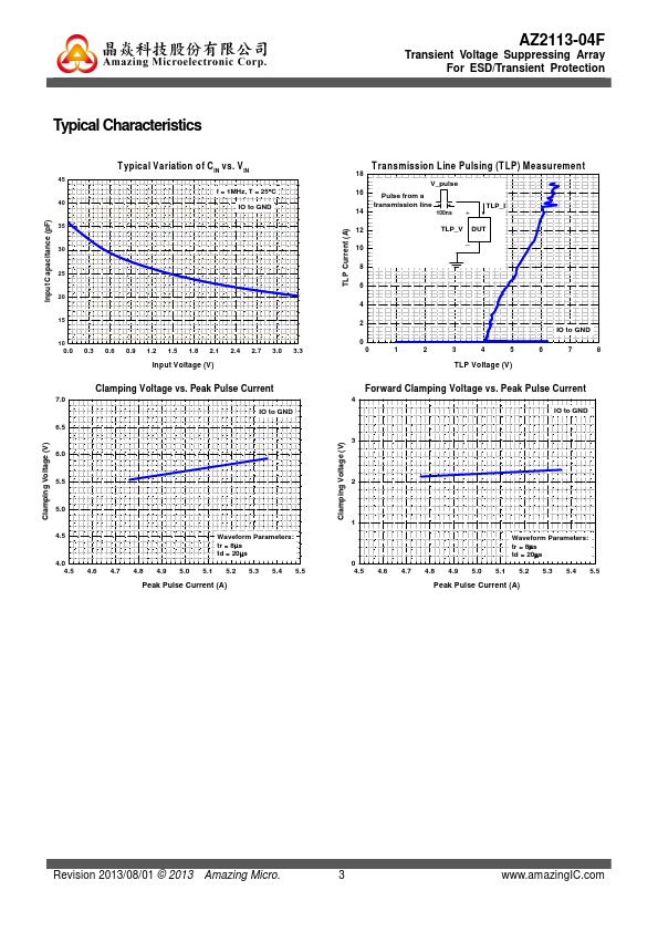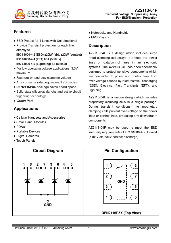 AZ2113-04F is a design which includes surge rated clamping cell arrays to protect the power lines or data/control lines in an electronic systems. The AZ2113-04F has been specifically designed to protect sensitive ponents which are connected to power and control lines from over-voltage caused by Electrostatic Discharging (ESD), Electrical Fast Transients (EFT), and Lightning. AZ2113-04F is a unique design which...