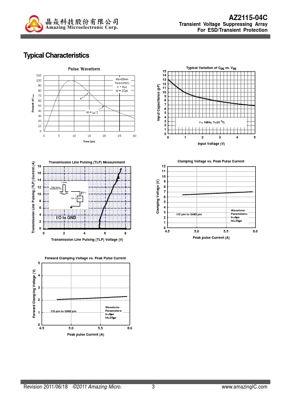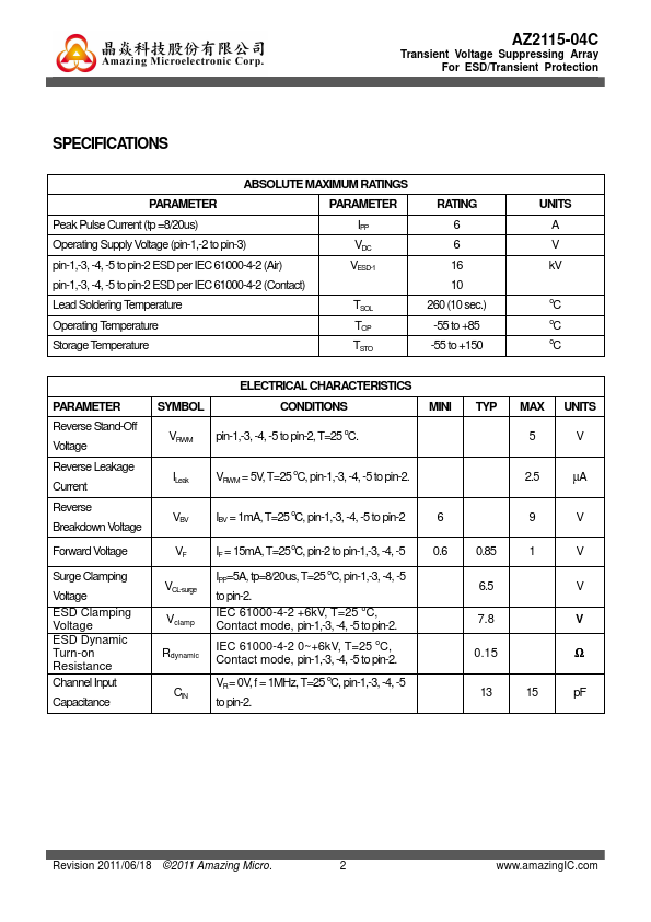 Circuit Diagram 1345 2 5 4 AZ2115-04C is a design which includes surge rated clamping cell arrays to protect the power lines or data/control lines in an electronic systems. The AZ2115-04C has been specifically designed to protect sensitive ponents which are connected to power and control lines from over-voltage caused by Electrostatic Discharging (ESD), Electrical Fast Transients (EFT), and Lightning. AZ2115-04C is...