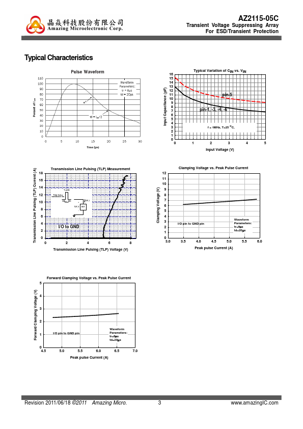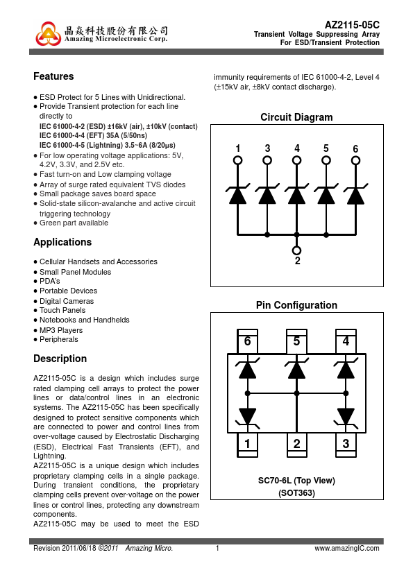 immunity requirements of IEC 61000-4-2, Level 4 (±15kV air, ±8kV contact discharge). Circuit Diagram 13456 2 6 5 4 AZ2115-05C is a design which includes surge rated clamping cell arrays to protect the power lines or data/control lines in an electronic systems. The AZ2115-05C has been specifically designed to protect sensitive ponents which are connected to power and control lines from over-voltage caused by...