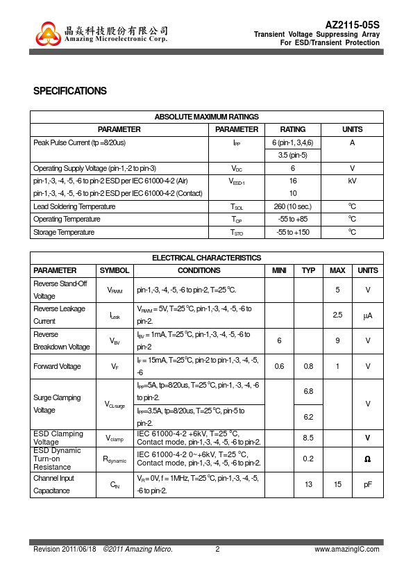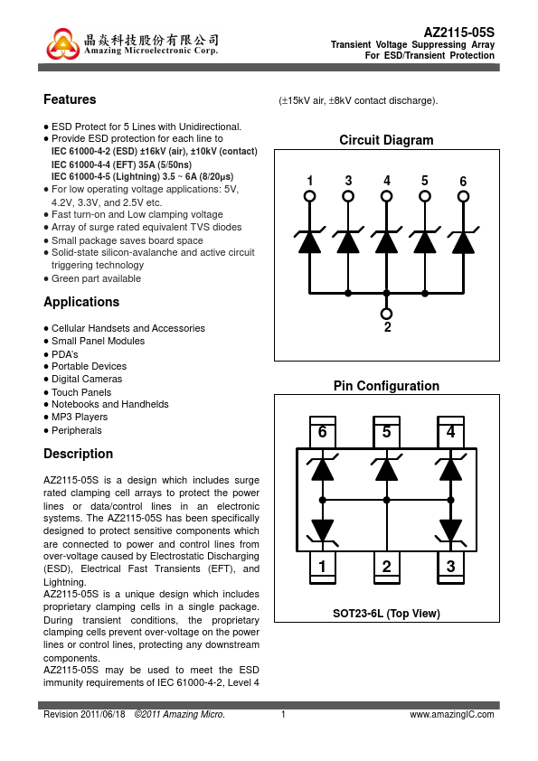 Circuit Diagram 13456 2 6 5 4 AZ2115-05S is a design which includes surge rated clamping cell arrays to protect the power lines or data/control lines in an electronic systems. The AZ2115-05S has been specifically designed to protect sensitive ponents which are connected to power and control lines from over-voltage caused by Electrostatic Discharging (ESD), Electrical Fast Transients (EFT), and Lightning. AZ2115-05S...