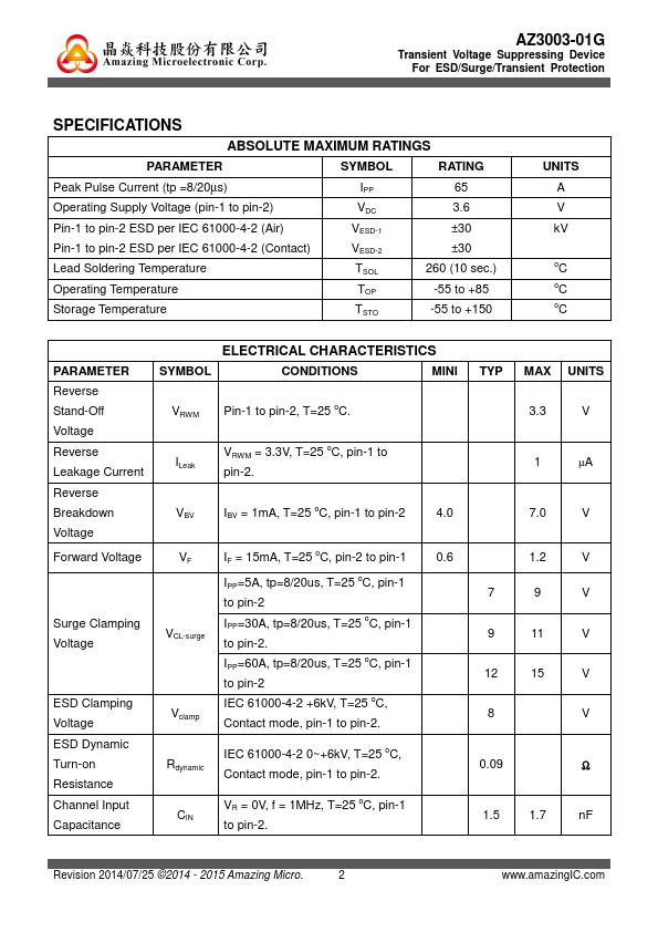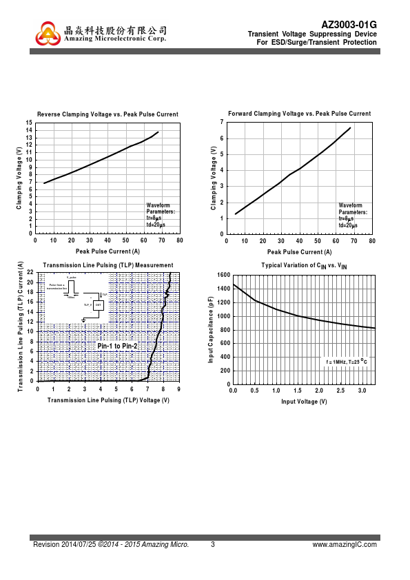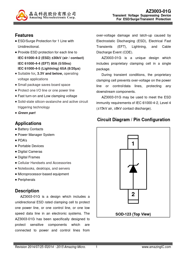 AZ3003-01G is a design which includes a unidirectional ESD rated clamping cell to protect one power line, or one control line, or one low speed data line in an electronic systems. The AZ3003-01G has been specifically designed to protect sensitive ponents which are connected to power and control lines from 2 SOD-123 (Top View) Revision 2014/07/25 ©2014 - 2015 Amazing Micro. ILeak VRWM = 3.3V, T=25 oC, pin-1 to pin-2.