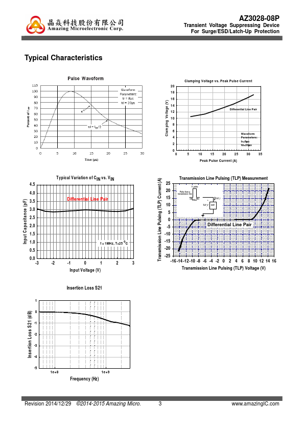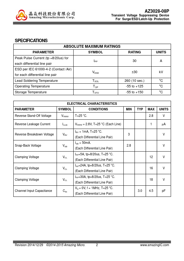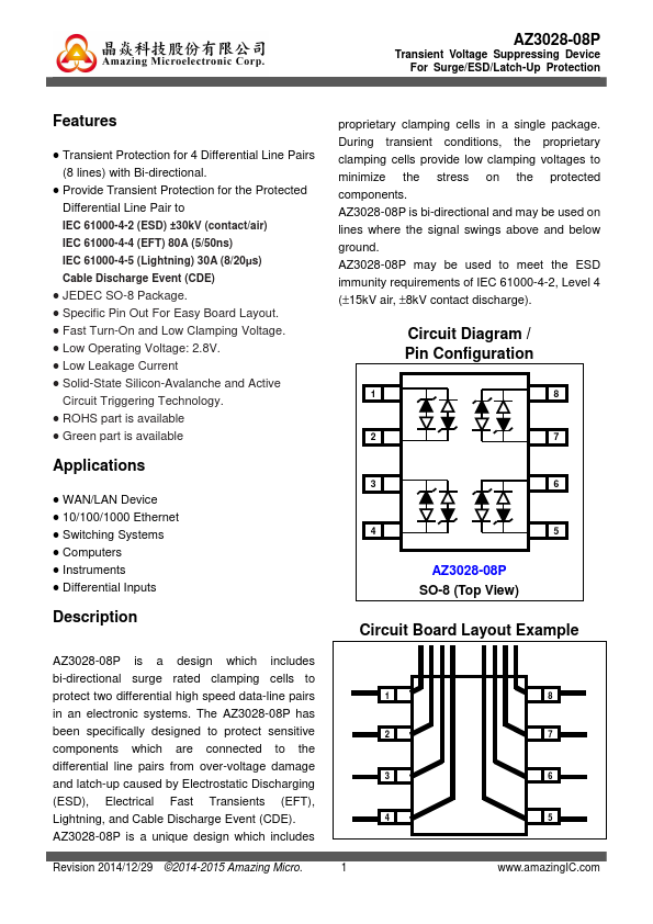 proprietary clamping cells in a single package. During transient conditions, the proprietary clamping cells provide low clamping voltages to minimize the stress on the protected ponents. AZ3028-08P is bi-directional and may be used on lines where the signal swings above and below ground.