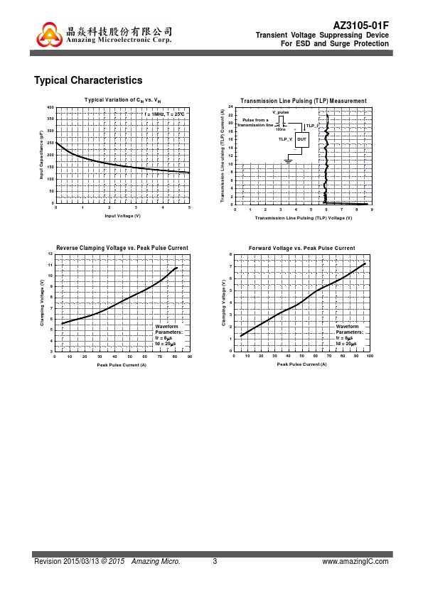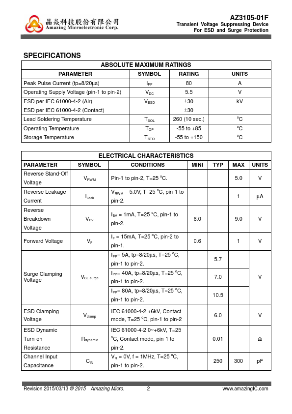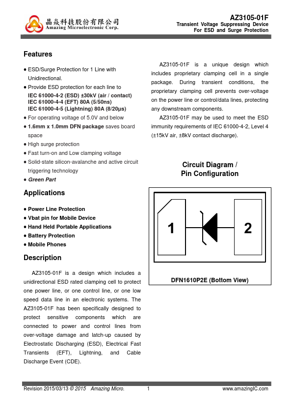 AZ3105-01F is a design which includes a unidirectional ESD rated clamping cell to protect one power line, or one control line, or one low speed data line in an electronic systems. The AZ3105-01F has been specifically designed to protect sensitive ponents which are connected to power and control lines from over-voltage damage and latch-up caused by Electrostatic Discharging (ESD), Electrical Fast Transients (EFT),...