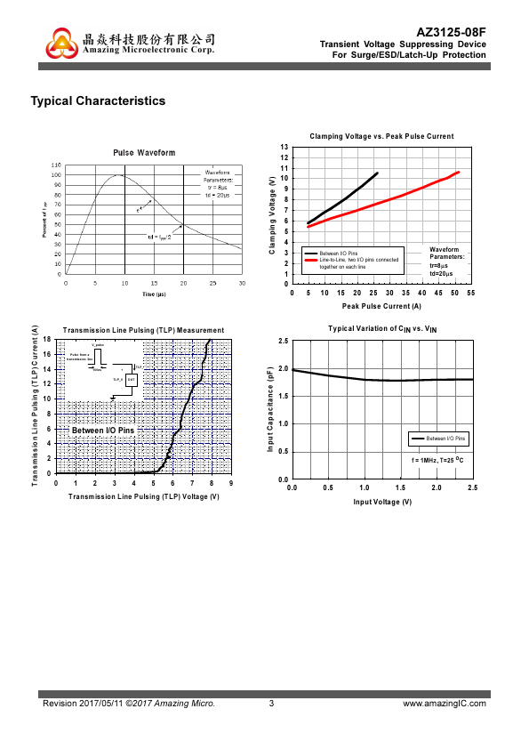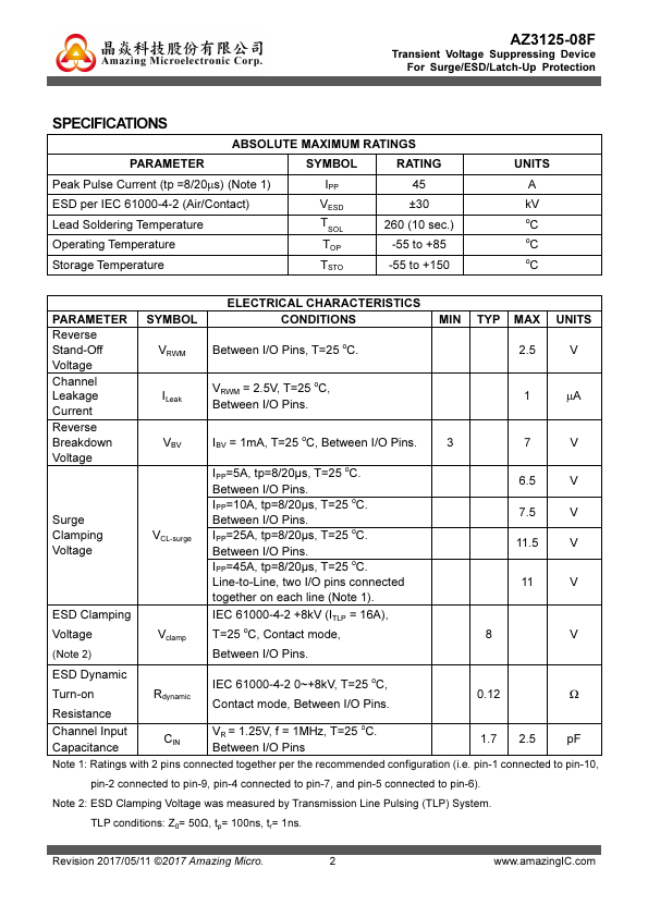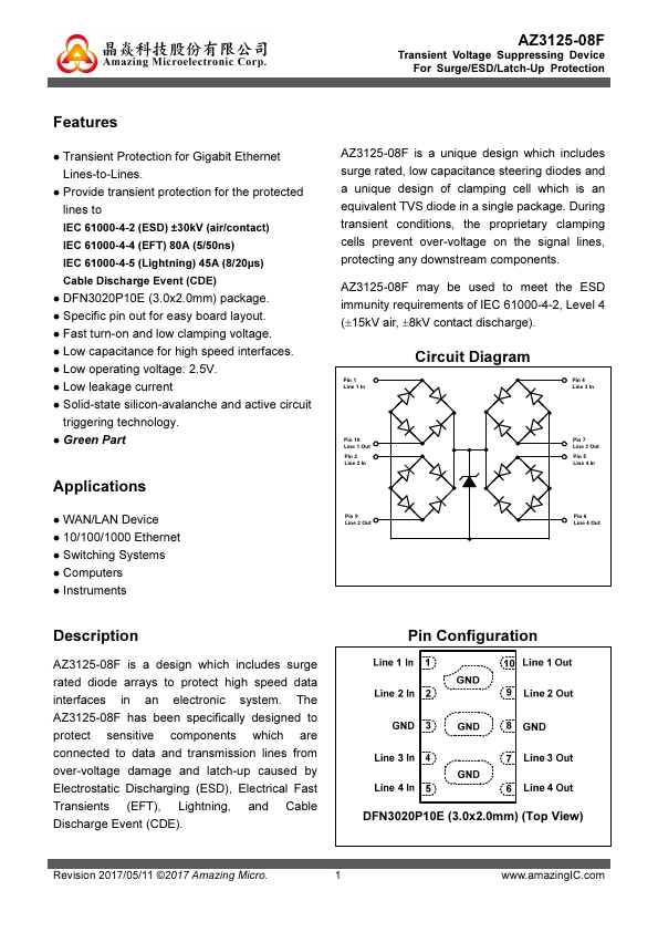 AZ3125-08F is a design which includes surge rated diode arrays to protect high speed data interfaces in an electronic system. The AZ3125-08F has been specifically designed to protect sensitive ponents which are connected to data and transmission lines from over-voltage damage and latch-up caused by Electrostatic Discharging (ESD), Electrical Fast Transients (EFT), Lightning, and Cable Discharge Event (CDE)....