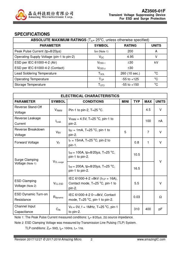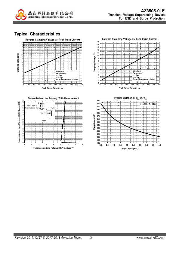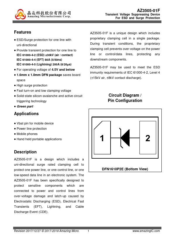 AZ3505-01F is a design which includes a uni-directional surge rated clamping cell to protect one power line, or one control line, or one low-speed data line in an electronic system. The AZ3505-01F has been specifically designed to protect sensitive ponents which are connected to power and control lines from over-voltage damage and latch-up caused by Electrostatic Discharging (ESD), Electrical Fast Transients (EFT),...