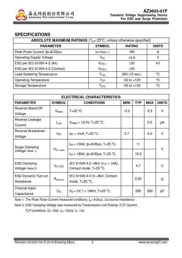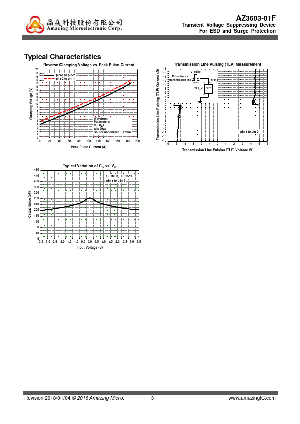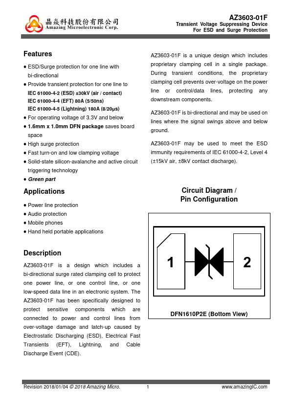 AZ3603-01F is a design which includes a bi-directional surge rated clamping cell to protect one power line, or one control line, or one low-speed data line in an electronic system. The AZ3603-01F has been specifically designed to protect sensitive ponents which are connected to power and control lines from over-voltage damage and latch-up caused by Electrostatic Discharging (ESD), Electrical Fast Transients (EFT),...
