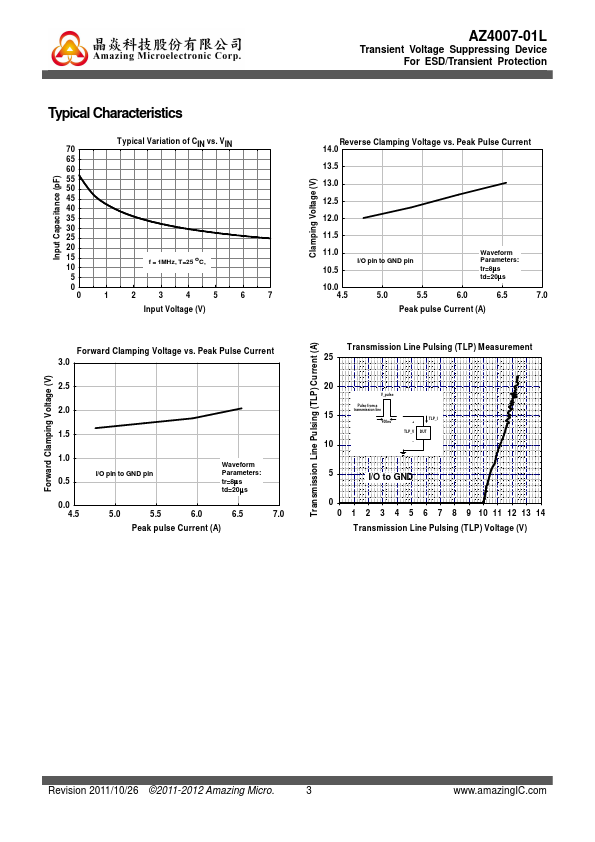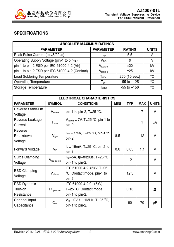 AZ4007-01L is a design which includes a unidirectional surge rated clamping cell to protect one power line, or one control line, or one low speed data line in an electronic systems. The AZ4007-01L has been specifically designed to protect sensitive ponents which are connected to power and control lines from over-voltage damage and latch-up caused by Electrostatic Discharging (ESD), Electrical Fast Transients (EFT),...