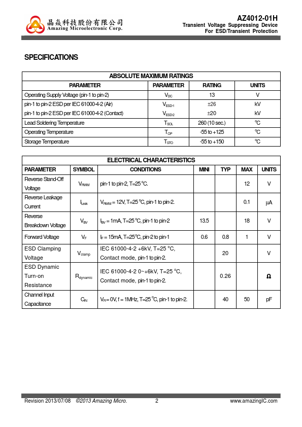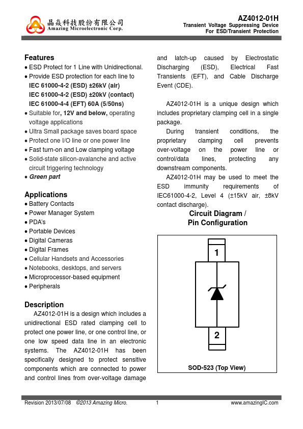 AZ4012-01H is a design which includes a unidirectional ESD rated clamping cell to protect one power line, or one control line, or one low speed data line in an electronic systems. The AZ4012-01H has been specifically designed to protect sensitive ponents which are connected to power and control lines from over-voltage damage 2 SOD-523 (Top View) Revision 2013/07/08 ©2013 Amazing Micro. Reverse Leakage Current ILeak...