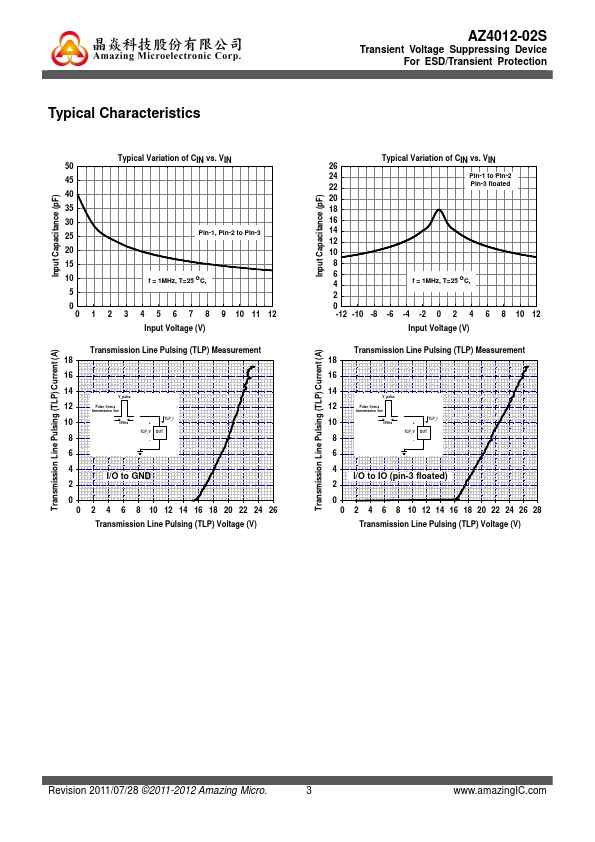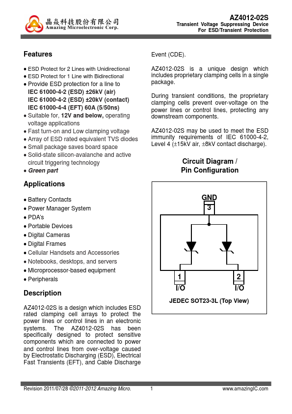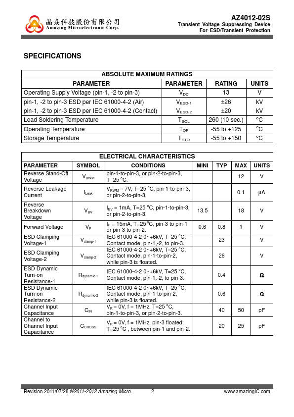 AZ4012-02S is a design which includes ESD rated clamping cell arrays to protect the power lines or control lines in an electronic systems. MINI ILeak VRWM = 7V, T=25 oC, pin-1-to-pin-3, or pin-2-to-pin-3. 13.5 IF = 15mA, T=25 oC, pin-3 to pin-1 or pin-3 to pin-2.