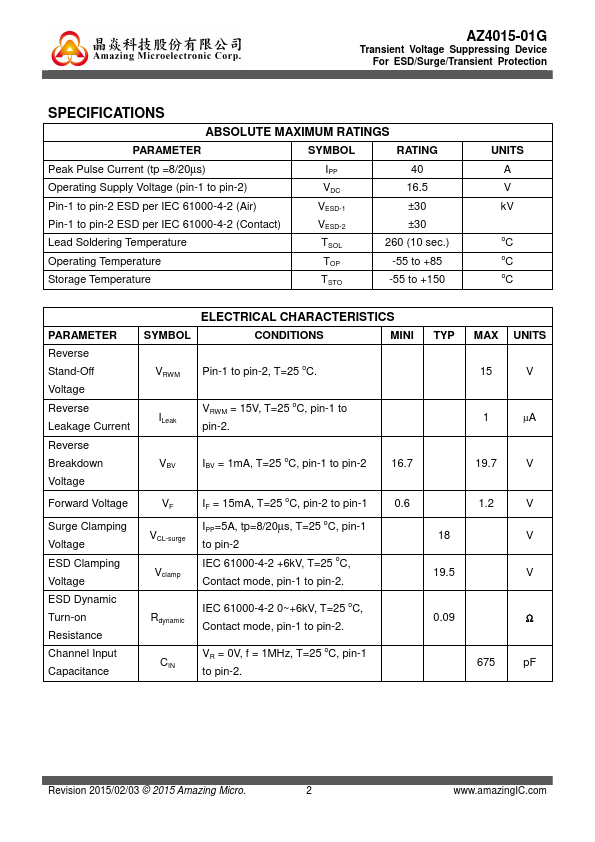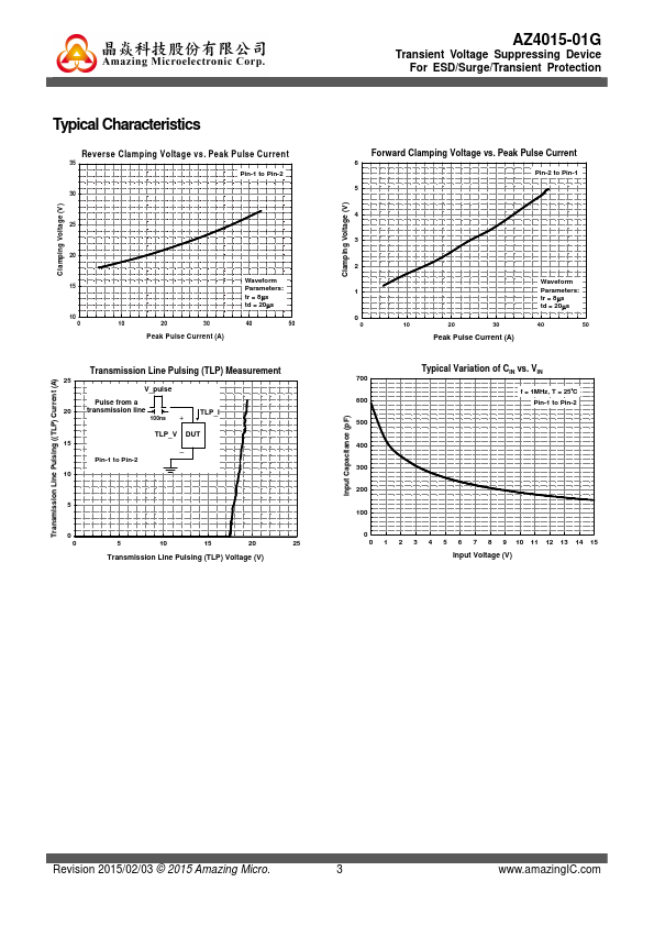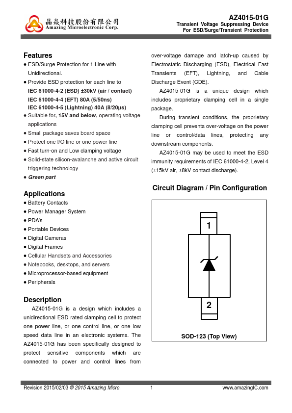 AZ4015-01G is a design which includes a unidirectional ESD rated clamping cell to protect one power line, or one control line, or one low speed data line in an electronic systems. The AZ4015-01G has been specifically designed to protect sensitive ponents which are connected to power and control lines from 2 SOD-123 (Top View) Revision 2015/02/03 © 2015 Amazing Micro. ILeak VRWM = 15V, T=25 oC, pin-1 to pin-2.