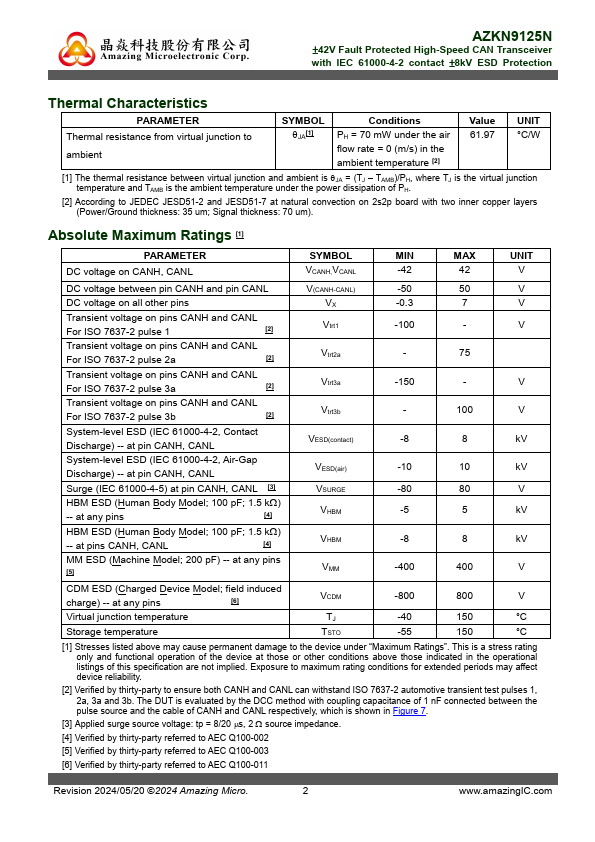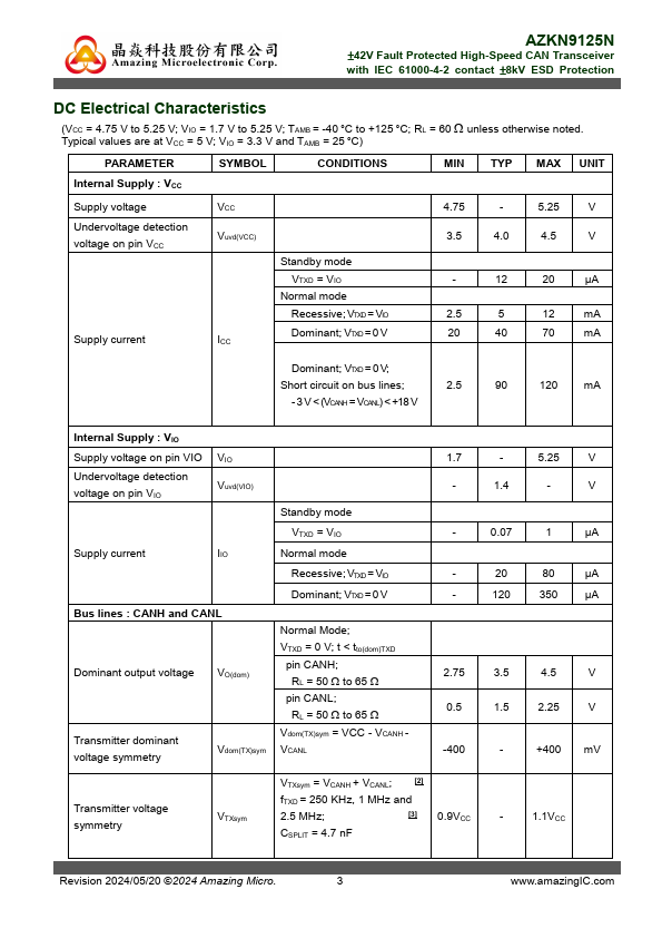 AZKN9125N is a ±8 kV IEC 61000-4-2 protected Controller Area Network (CAN) transceiver IC. It serves as an interface between a CAN protocol controller (MCU) and the physical two-wire CAN bus. This device operates at 5 V power supply and is fully pliant with ISO 11898-2:2016 standard for CAN FD application.
