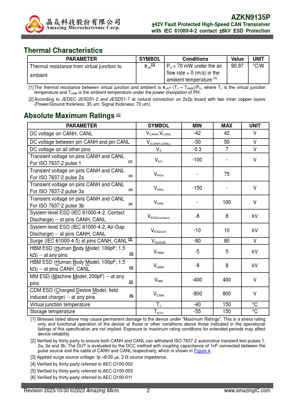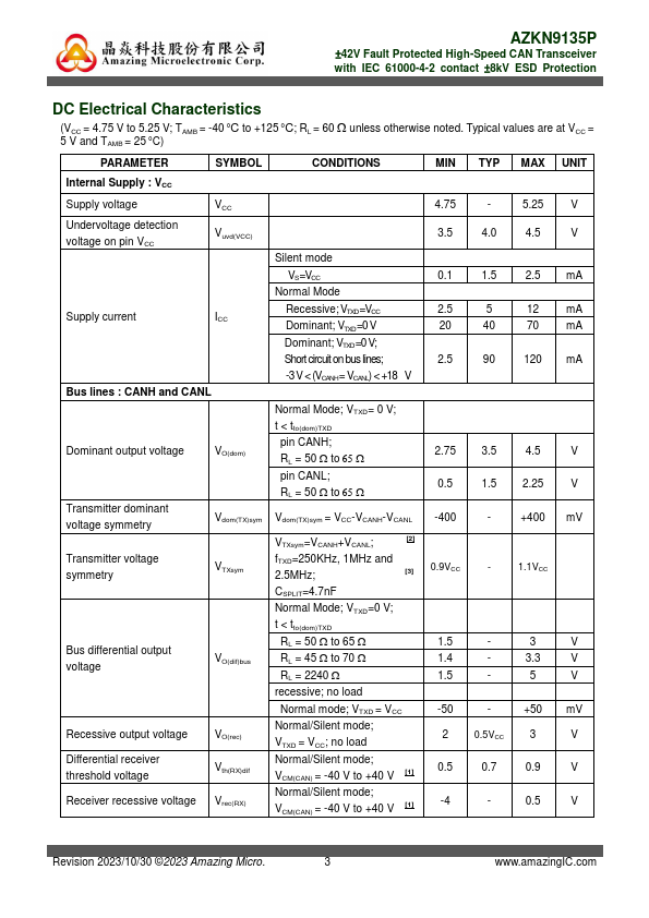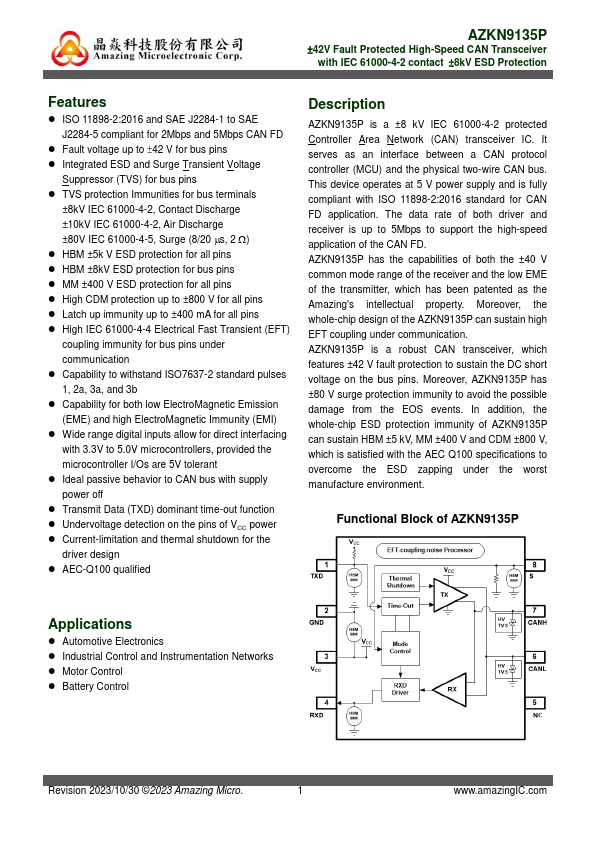 AZKN9135P is a ±8 kV IEC 61000-4-2 protected Controller Area Network (CAN) transceiver IC. It serves as an interface between a CAN protocol controller (MCU) and the physical two-wire CAN bus. This device operates at 5 V power supply and is fully pliant with ISO 11898-2:2016 standard for CAN FD application.