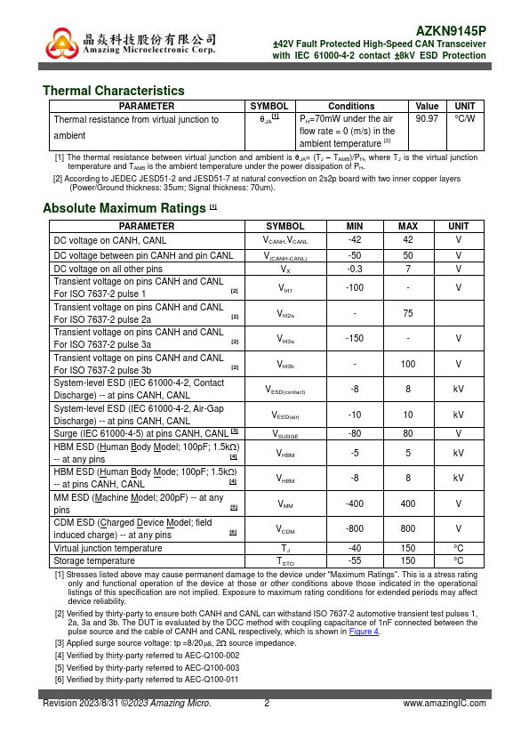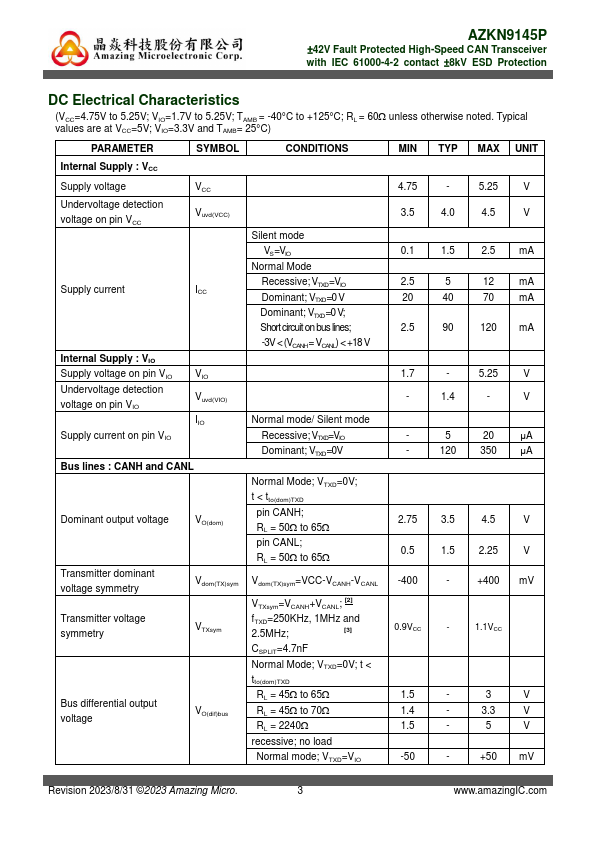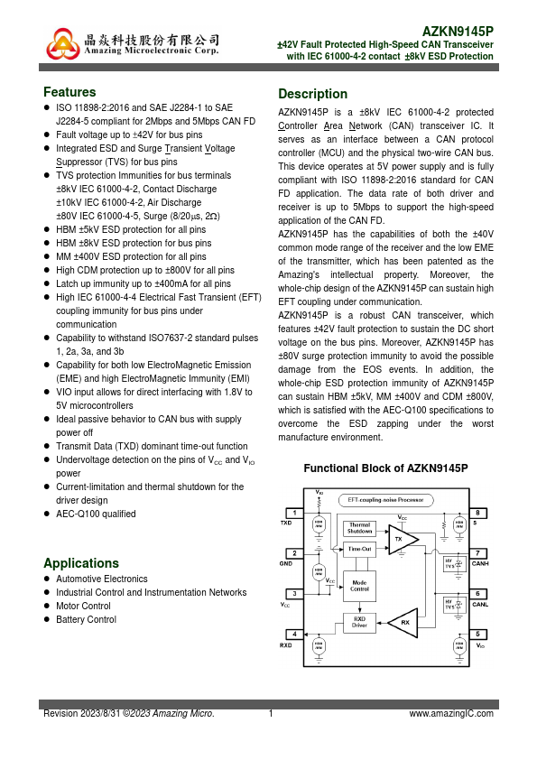 AZKN9145P is a ±8kV IEC 61000-4-2 protected Controller Area Network (CAN) transceiver IC. It serves as an interface between a CAN protocol controller (MCU) and the physical two-wire CAN bus. This device operates at 5V power supply and is fully pliant with ISO 11898-2:2016 standard for CAN FD application.