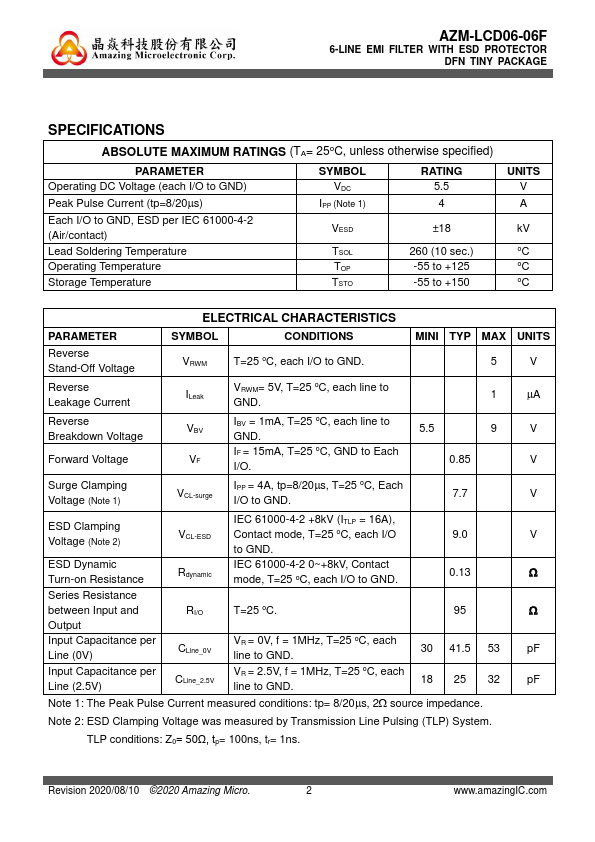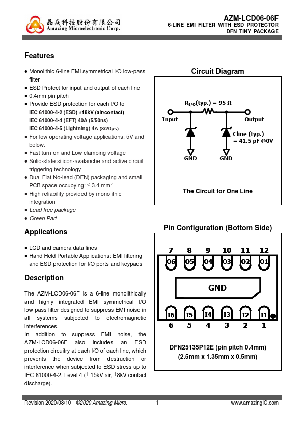 The AZM-LCD06-06F is a 6-line monolithically and highly integrated EMI symmetrical I/O low-pass filter designed to suppress EMI noise in all systems subjected to electromagnetic interferences. In addition to suppress EMI noise, the AZM-LCD06-06F also includes an ESD protection circuitry at each I/O of each line, which prevents the device from destruction or interference when subjected to ESD stress up to IEC...