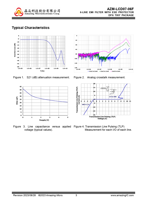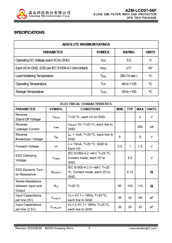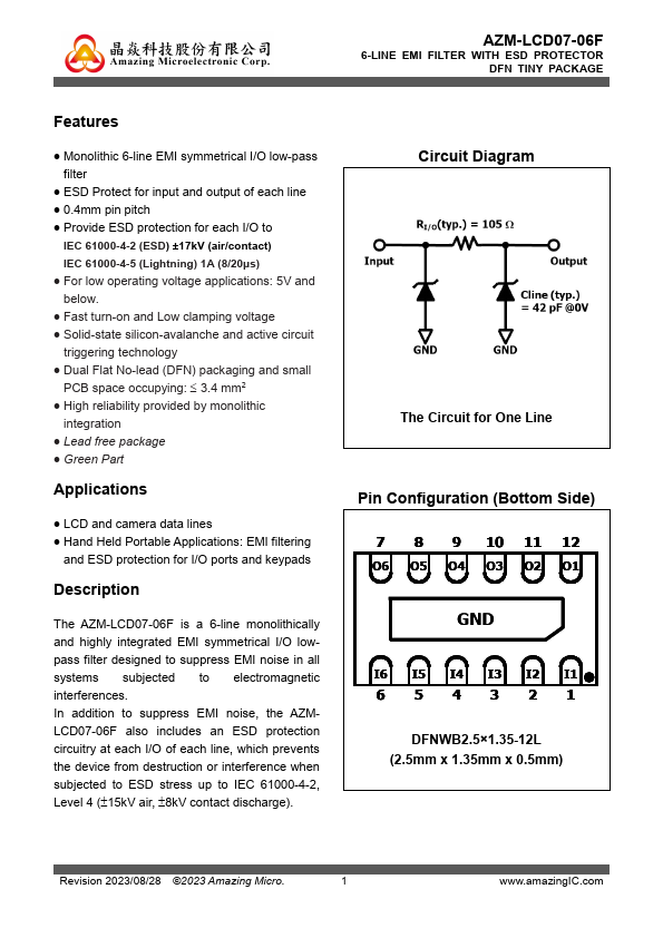 The AZM-LCD07-06F is a 6-line monolithically and highly integrated EMI symmetrical I/O lowpass filter designed to suppress EMI noise in all systems subjected to electromagnetic interferences. In addition to suppress EMI noise, the AZMLCD07-06F also includes an ESD protection circuitry at each I/O of each line, which prevents the device from destruction or interference when subjected to ESD stress up to IEC...