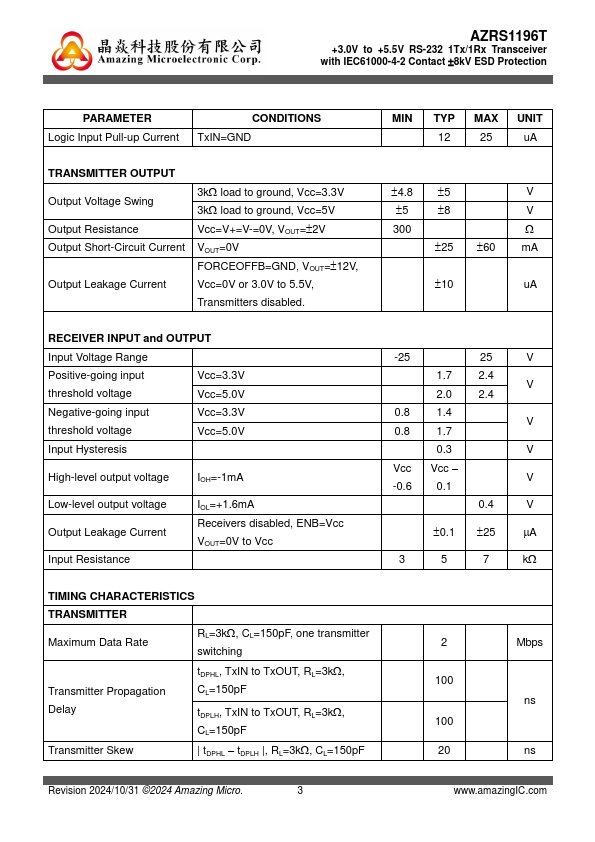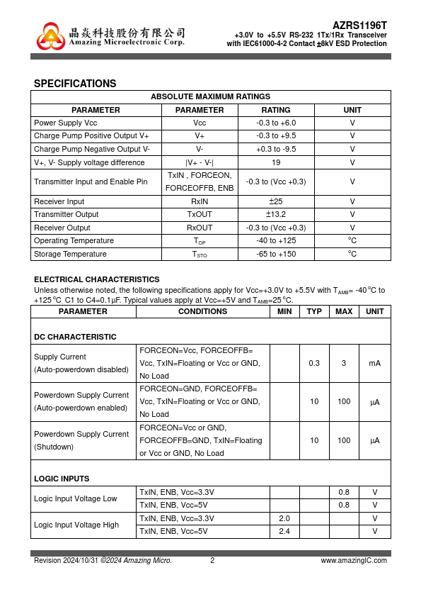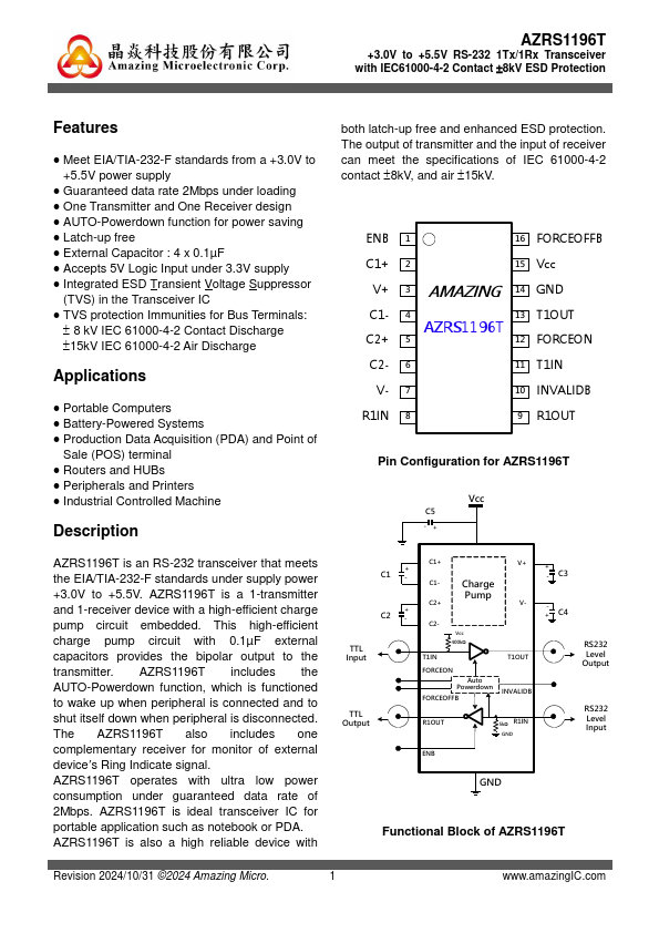 + - both latch-up free and enhanced ESD protection. The output of transmitter and the input of receiver can meet the specifications of IEC 61000-4-2 contact 8kV, and air 15kV. AZRS1196T is a 1-transmitter and 1-receiver device with a high-efficient charge pump circuit embedded.