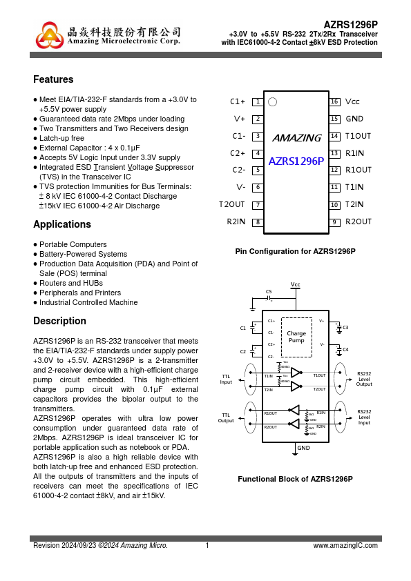 AZRS1296P is an RS-232 transceiver that meets the EIA/TIA-232-F standards under supply power +3.0V to +5.5V. AZRS1296P is a 2-transmitter and 2-receiver device with a high-efficient charge pump circuit embedded. This high-efficient charge pump circuit with 0.1µF external capacitors provides the bipolar output to the transmitters.