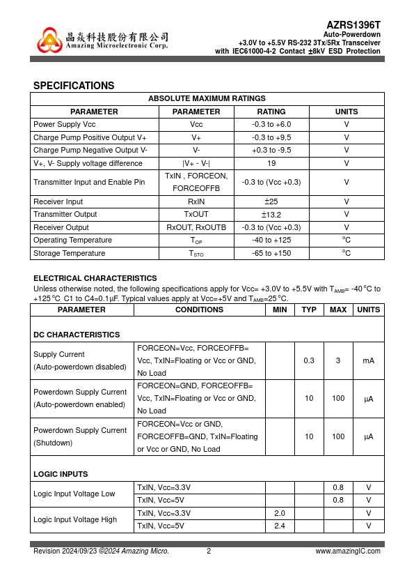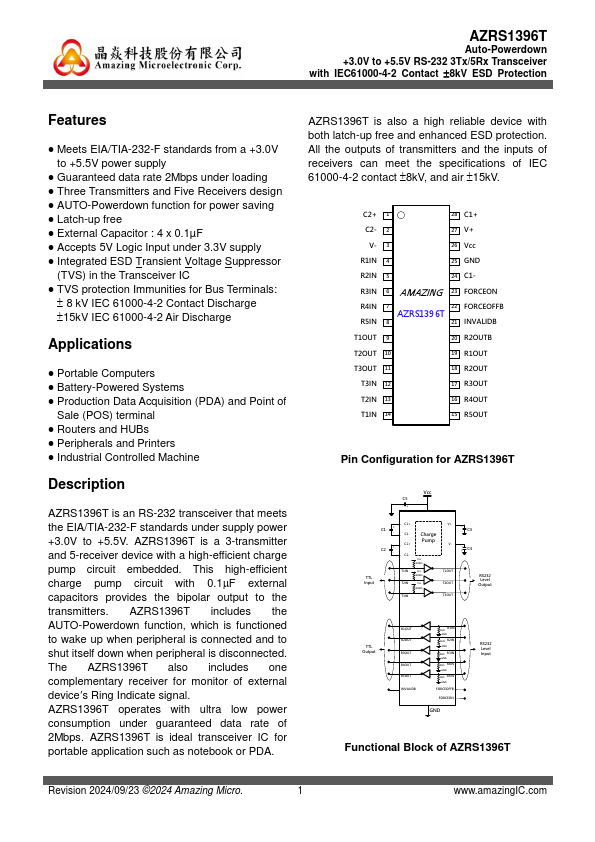 AZRS1396T is an RS-232 transceiver that meets the EIA/TIA-232-F standards under supply power +3.0V to +5.5V. AZRS1396T is a 3-transmitter and 5-receiver device with a high-efficient charge pump circuit embedded. This high-efficient charge pump circuit with 0.1F external capacitors provides the bipolar output to the transmitters.
