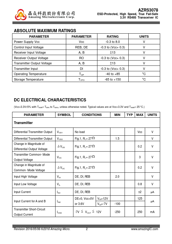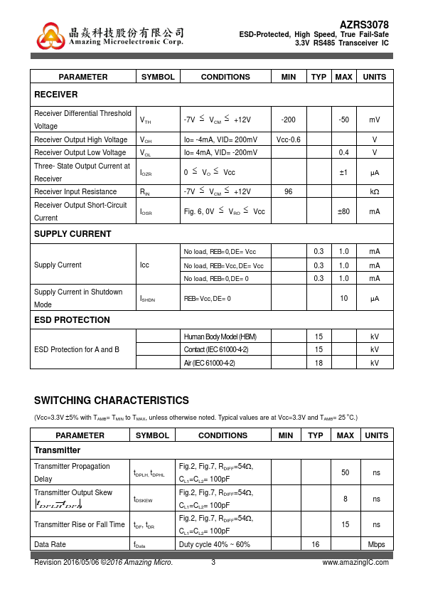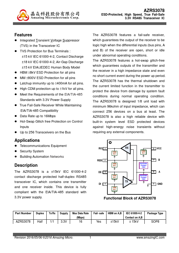 The AZRS3078 is a ±15kV IEC 61000-4-2 contact discharge protected half-duplex RS485 transceiver IC, which contains one transmitter and one receiver inside. This device is fully pliant with the EIA/TIA-485 standard with 3.3V power supply.