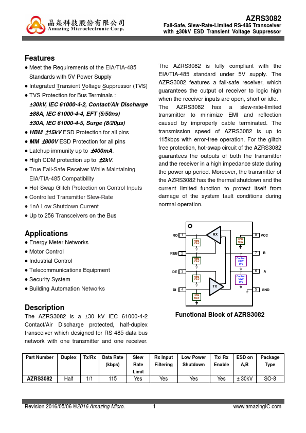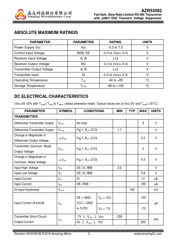 The AZRS3082 is a ±30 kV IEC 61000-4-2 Contact/Air Discharge protected, half-duplex transceiver which designed for RS-485 data bus network with one transmitter and one receiver. Typical values are at Vcc=5V and TAMB= 25 oC.) PARAMETER TRANSMITTER SYMBOL CONDITIONS MIN TYP MAX UNI.
