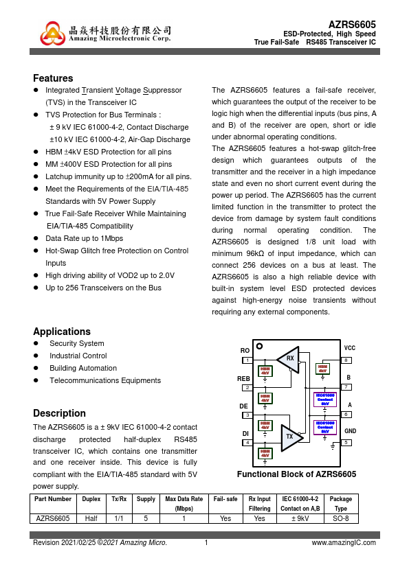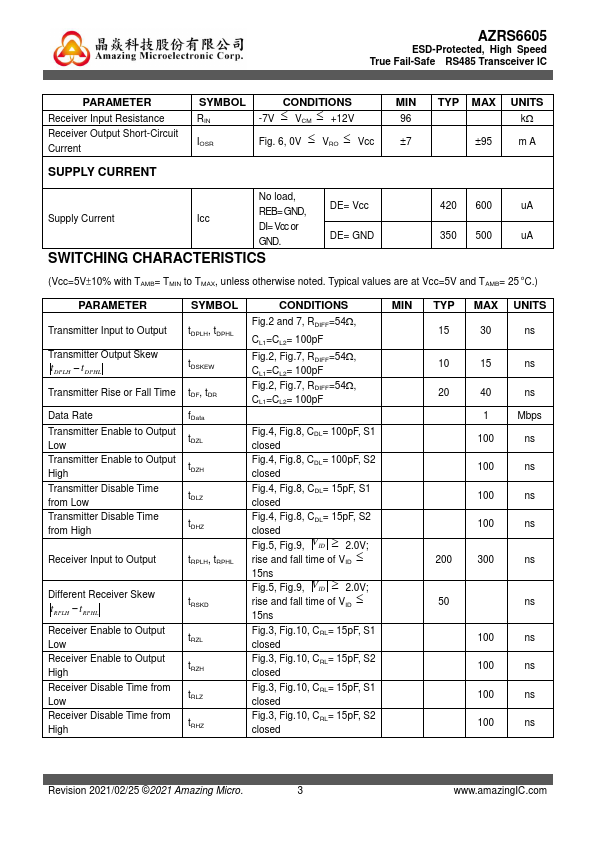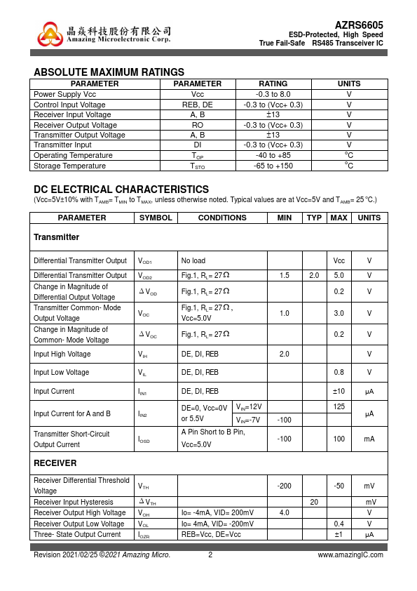The AZRS6605 is a ± 9kV IEC 61000-4-2 contact discharge protected half-duplex RS485 transceiver IC, which contains one transmitter and one receiver inside. This device is fully pliant with the EIA/TIA-485 standard with 5V power supply. Typical values are at Vcc=5V and TAMB= 25 oC.) PARAMETER SYMBOL CONDITIO.
