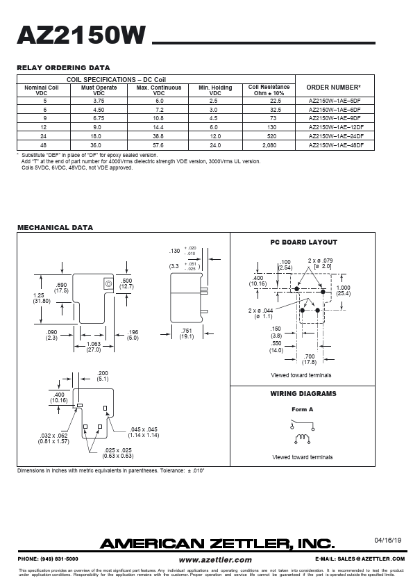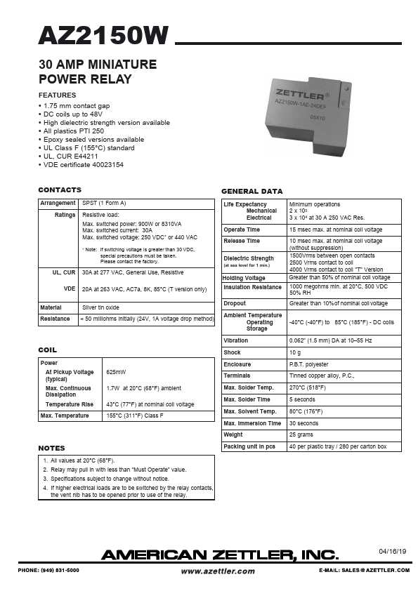 AZ2150W 30 AMP MINIATURE POWER RELAY.