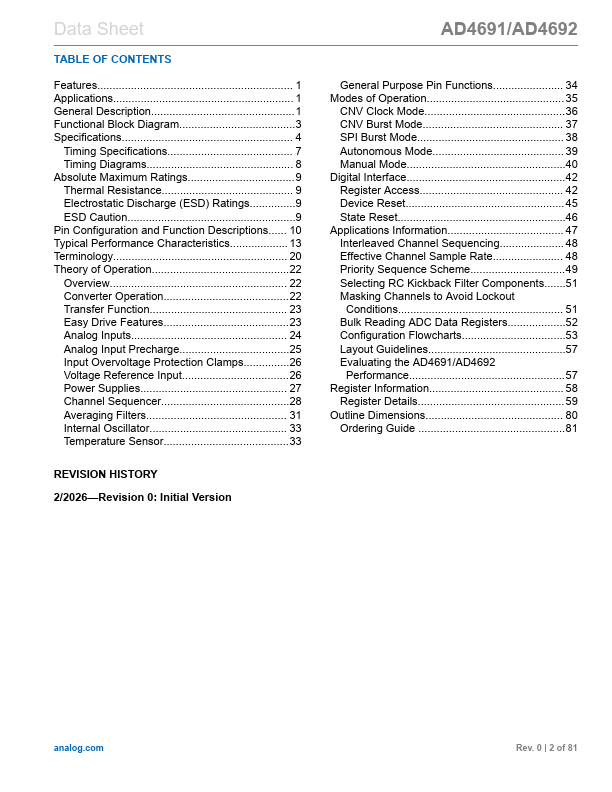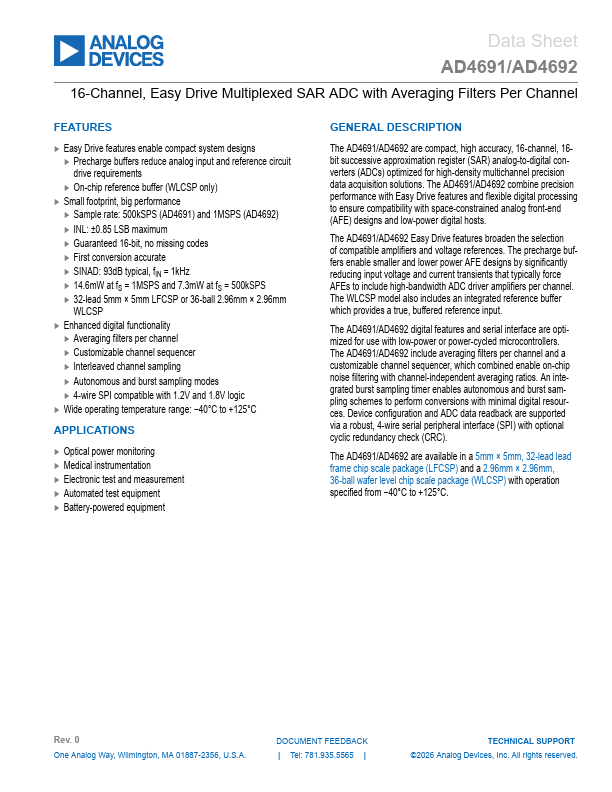 The AD4691/AD4692 are pact, high accuracy, 16-channel, 16bit successive approximation register (SAR) analog-to-digital converters (ADCs) optimized for high-density multichannel precision data acquisition solutions. The AD4691/AD4692 bine precision performance with Easy Drive.