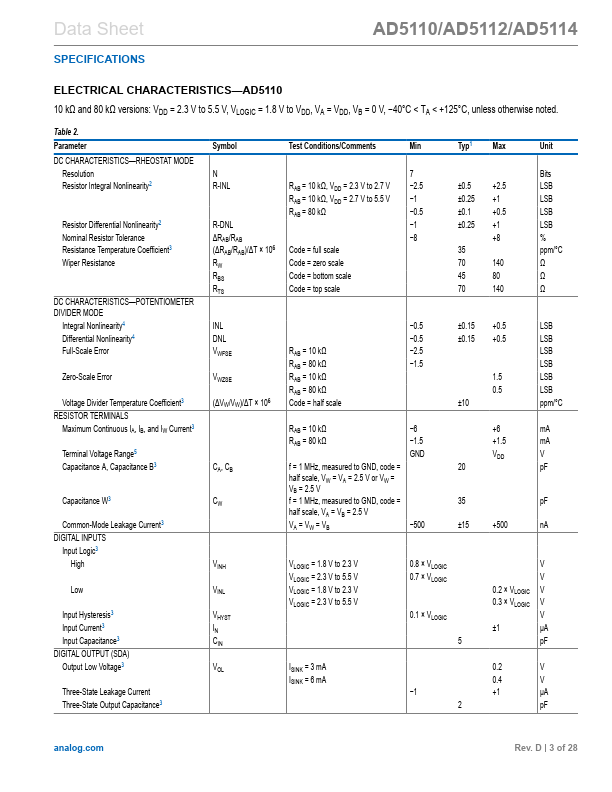 The AD5110/AD5112/AD5114 provide a nonvolatile solution for 128-/64-/32-position adjustment applications, offering guaranteed low resistor tolerance errors of ±8% and up to ±6 mA current density in the A, B, and W pins. The low resistor tolerance, low nominal temperature coefficient and high bandwidth simplify openloop applications, as well as tolerance matching applications. The new low wiper resistance.