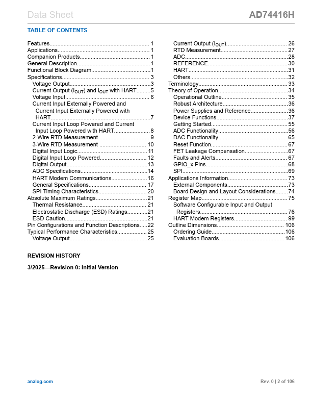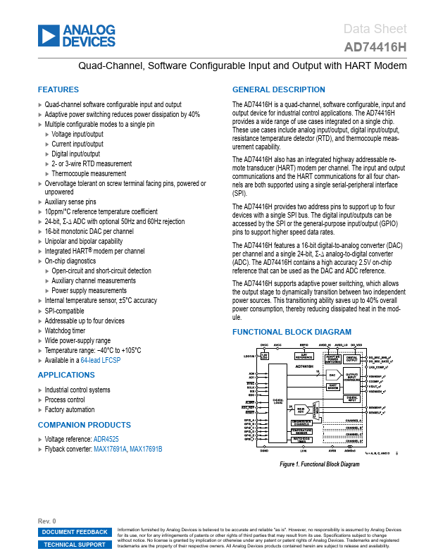 The AD74416H is a quad-channel, software configurable, input and output device for industrial control applications. The AD74416H provides a wide range of use cases integrated on a single chip. These use cases include analog input/output, digital input/output, resistance temperature detector (RTD), and thermocouple measurement capability.