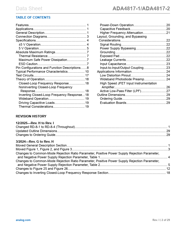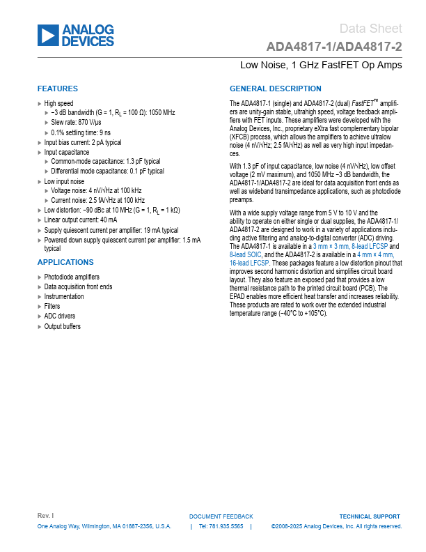 The ADA4817-1 (single) and ADA4817-2 (dual) FastFET™ amplifiers are unity-gain stable, ultrahigh speed, voltage feedback amplifiers with FET inputs.