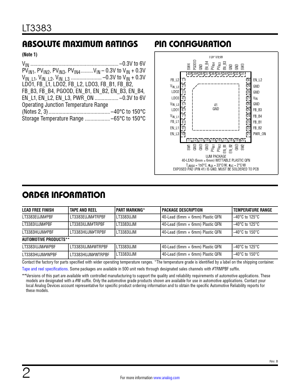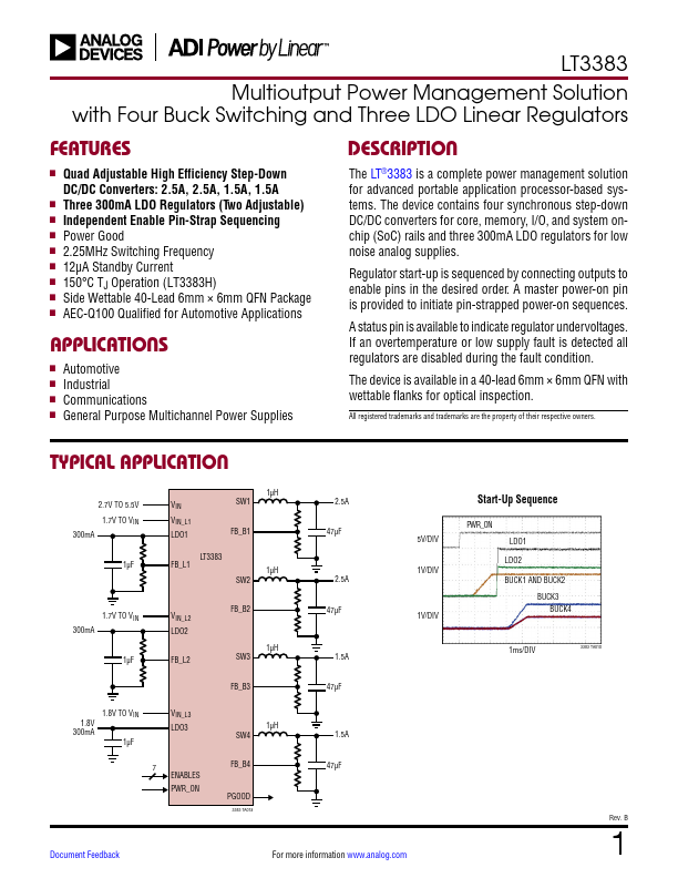 The LT®3383 is a plete power management solution for advanced portable application processor-based systems. The device contains four synchronous step-down DC/DC converters for core, memory, I/O, and system onchip (SoC) rails and three 300mA LDO regulators for low noise analog supplies. Regulator start-up is sequenced by connecting outputs to enable pins in the desired order.